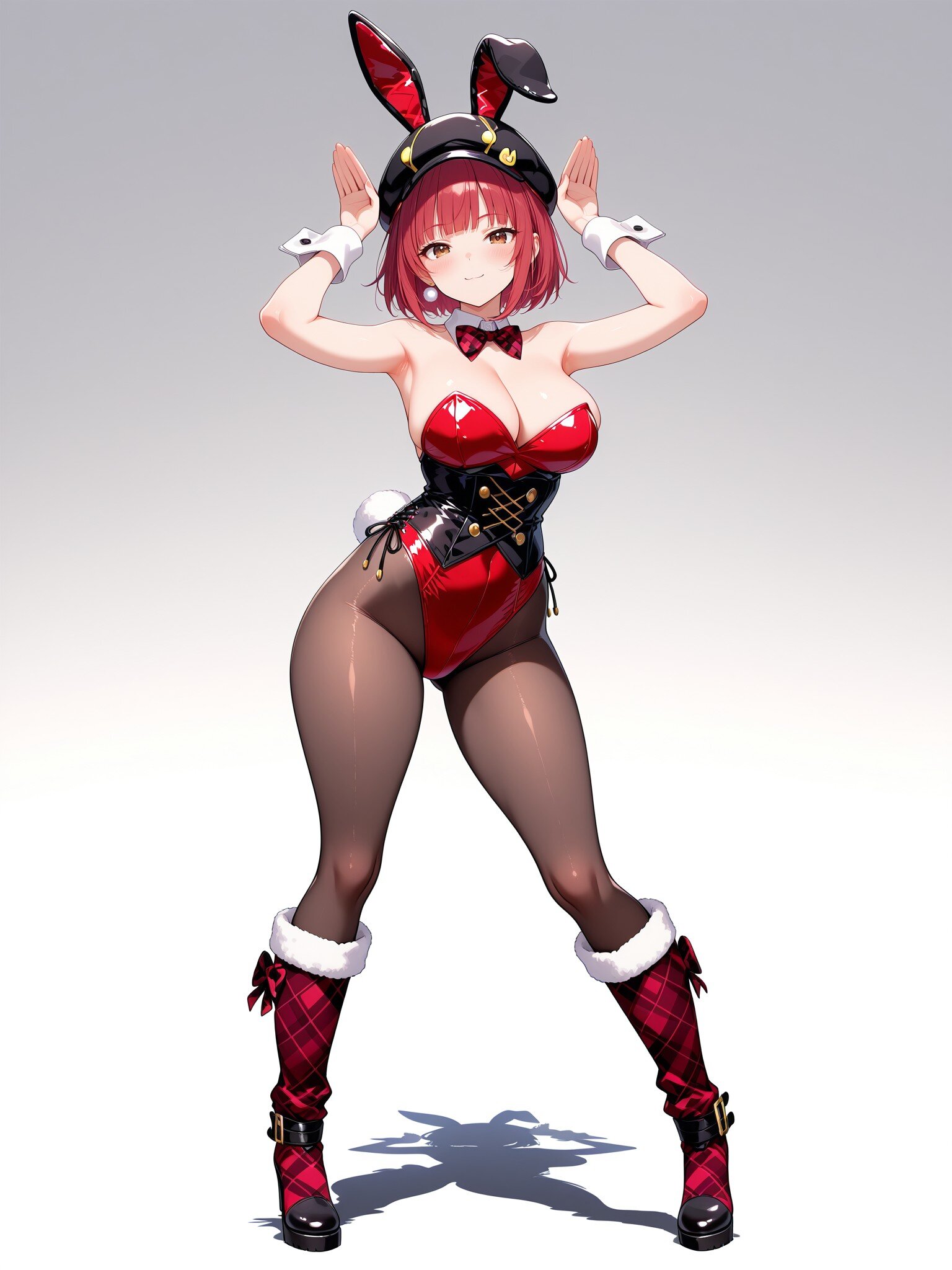(bunny hat:2.0), (tartan check bunny:2.0), bunny suit, tightly fitted, pattern features red and black plaid with fine white lines, white fluffy tail, tall black bunny ears, (tartan check fur boots:2.0),