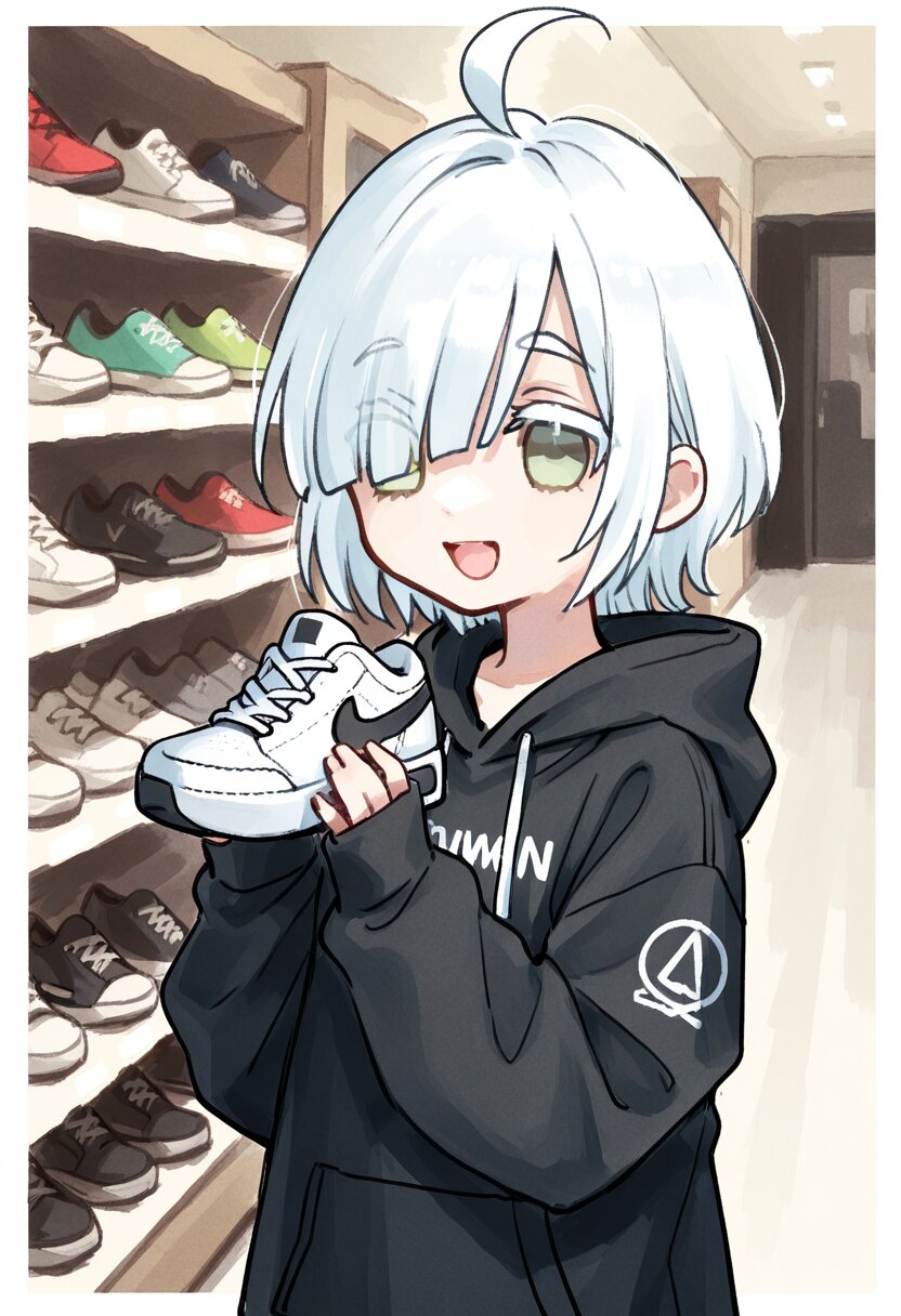 <lora:inmnstyleilxl:0.9>, best quality, masterpiece, very aesthetic, watercolor painting, general, 1girl, chibi, solo, (bright white hair), short hair, blunt bangs, white thick eyebrow, white colored eyelashes, (hair over one eye), ahoge, mintgreen eyes, oversize black hoodie, sleeves past wrists, smile, open mouth, holding white sneaker, shoe store, upper body