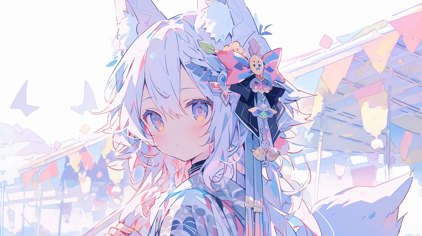 夏の夜空に浮かぶ提灯の光の中、白い狐耳の少女が浴衣姿で佇む。彼女は古い伝説の守り人として、祭りの喧騒に紛れて大切な約束を果たそうとする。花火が上がる瞬間、彼女の紫の瞳に映るのは、失われた友との思い出か、それとも新たな冒険の予感か。優しい風が髪を揺らし、祭りの賑わいが彼女の孤独を優しく包み込む。あなたもこの幻想的な夜に、彼女の物語に耳を傾けてみては?