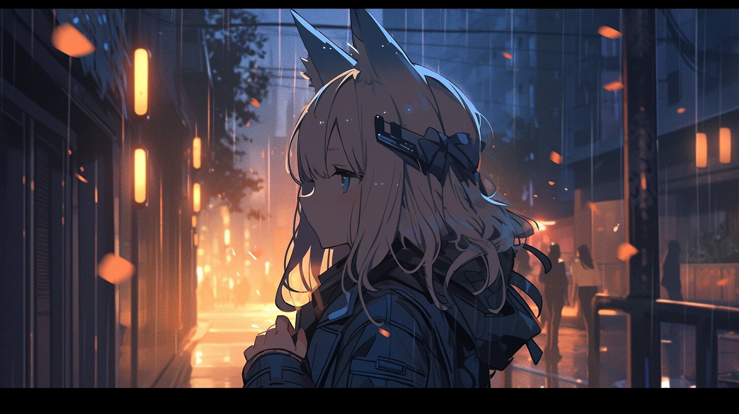 雨が静かに降り注ぐ夜の街路。キツネ耳の少女は、フードを被りながら振り返る。彼女の瞳には、失われた恋人の影が映るのだろうか。街灯の暖かな光が落ち葉を照らし、遠くの足音が近づく。日常の喧騒から逃れ、この瞬間、彼女は古い記憶を呼び起こす。雨音が織りなすメロディの中で、どんな冒険が待っているのか。読み手の心を優しく揺さぶる、幻想的な一幕。