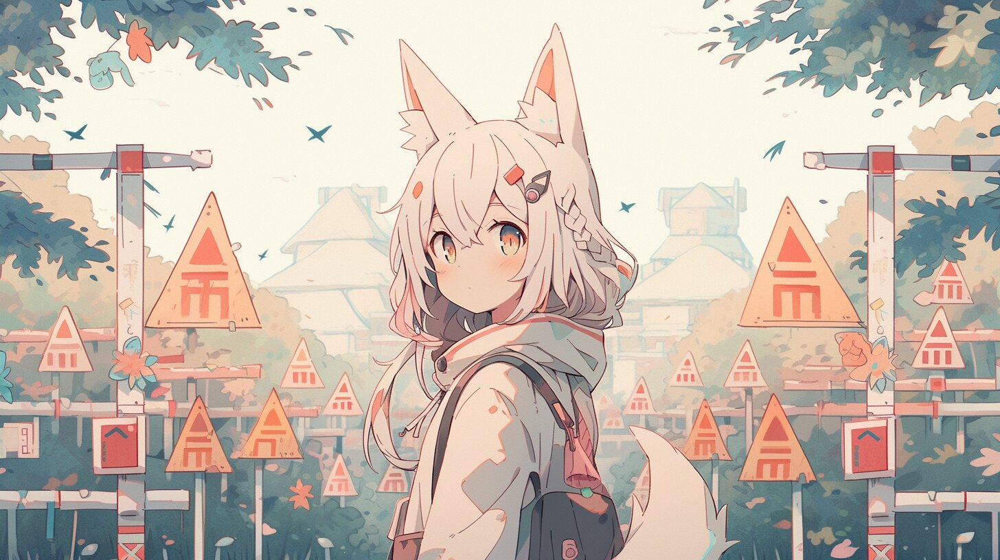 白い毛並みの狐娘が、バックパックを背負って不思議な森を歩く。無数の三角標識が立ち並び、まるで迷路のような道を指し示す。彼女の緑の瞳には好奇心が輝き、遠くの街並みを目指して一歩を踏み出す。どんな冒険が待っているのか? 落ち葉が舞う風に乗り、彼女の日常はいつもワクワクの連続。君も一緒に旅に出よう!