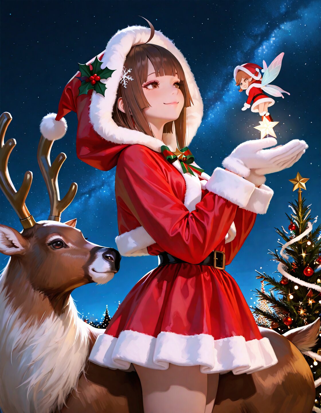 solo, 1girl, brown hair, brown eyes, blunt bangs, ahoge, short hair, straight hair,hime cut, delicate face, detailed face, detailed skin, masterpiece, best quality, insanely detailed, highly detailed, intricate, detailed eyes, beautiful eyes, beautiful face, beautiful hair, beautiful,photorealistic,16k,smile,santa claus costume,idol costume,long sleeves,hood up,white fluffy gloves,hair ornament,at Christmas,cute,dreamy atmosphere,fairy academia,hyperrealistic photo,at night,(with a reindeer),cowboy shot,side view,starry sky