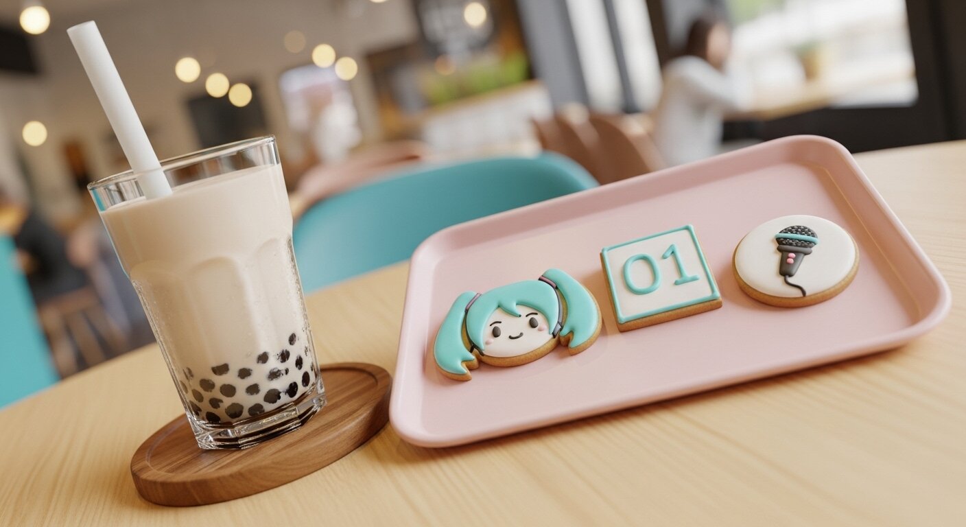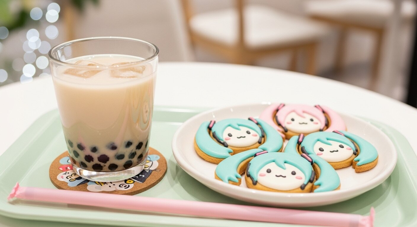 Tapioca milk tea.coaster and kawaii simple hatsune-miku icing cookies dish pastel-colored-tray table cafe dynamic-angle