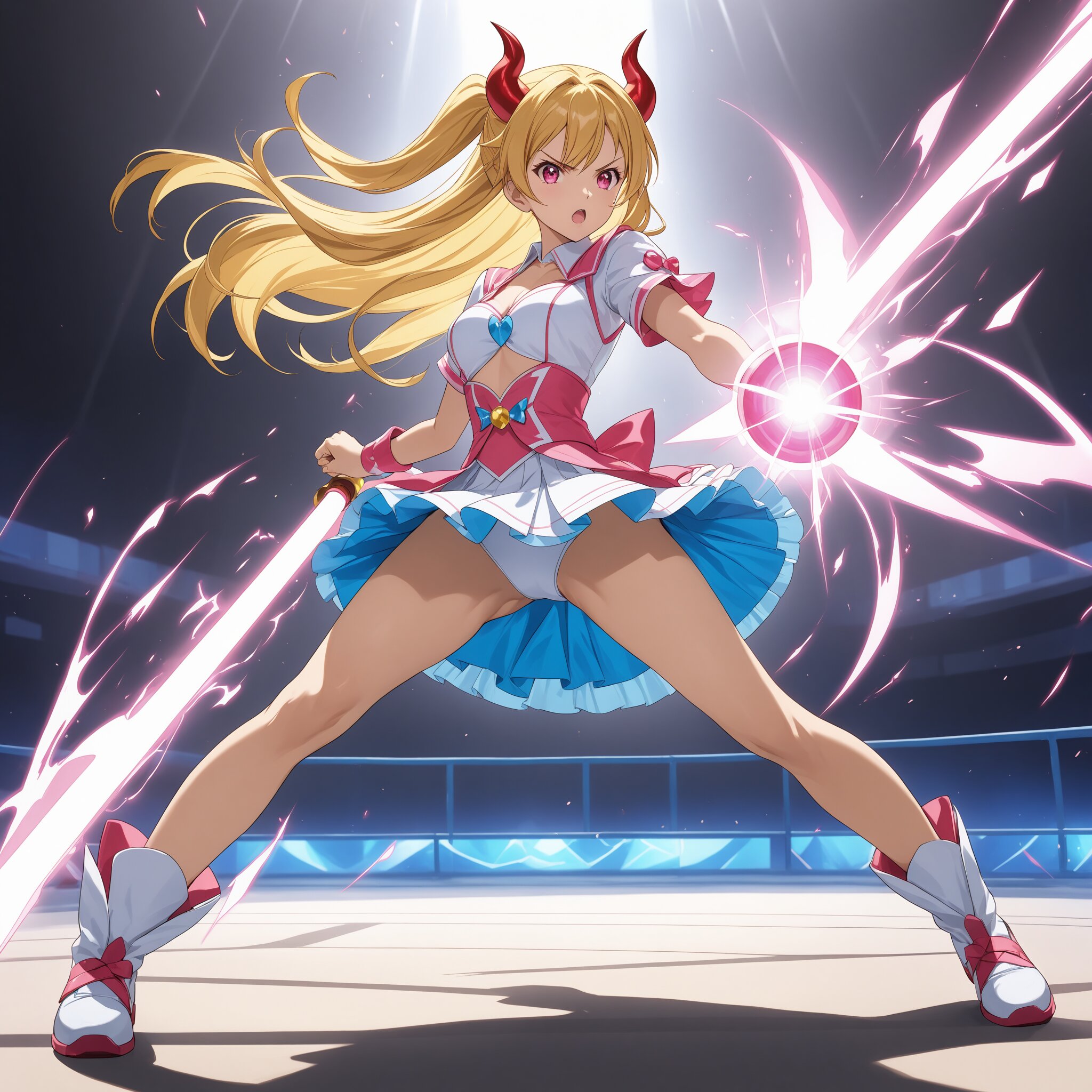 masterpiece, best quality, photorealistic, sharp focus, cinematic lighting, depth of field, beautiful composition, vibrant colors, ultra high res, 8K, highly detailed, masterpiece, best quality, very detailed, score_9, score_8_up, score_7_up, score_6_up, score_5_up, score_4_up, source_anime, full body, lora:P0w3eeerXL_Pony_v1:1 1girl, p0w3r0x1, long hair, blonde hair, red horns, demon pupils, Cure Summer (Precure) official outfit, action pose, kicking, punching, battle stance, determined expression, attacking, special move, colorful energy, fighting evil, heroic, focused intensity
