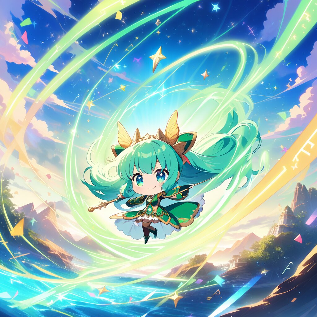 Sparkling lines of fluorescent paint, countless /* A woman who has both Al and the power of Al. Wizard, wand, large scale, air current, green storm, hurricane, plants, particles of light/* (alphabet notation: 1.5) curtain girl) /* Large requires an item to use. Light Green & Light Blue, Smile, Epic, Celestia, Fantasy World, Cute World /* ( Magic (Anime style) (Familiar)in the style of a chibi character.