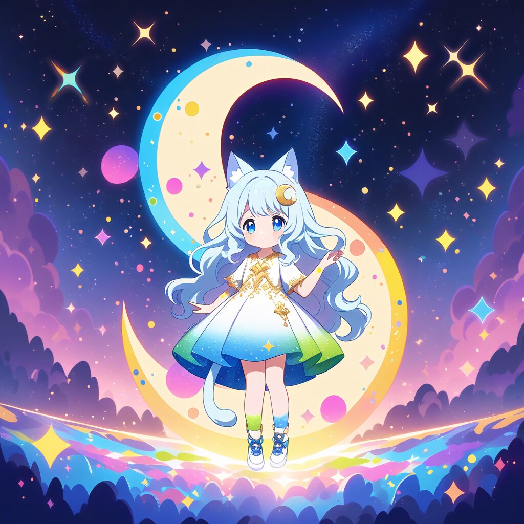 Crescent moon, blue eyes, white cat girl, white wavy hair, crescent moon hair clip, cat tail, cat girl (familiar face), cute pose (Triple Paint: 1.3) (Pointillism: 1.3) (Thick Paint: 1.4) (Night sky with a crescent moon: 1.3) Full body,white dress with gold embroidery, skirt with small blue laces. Fantasy world, cute world. (Anime style) (Familiar)