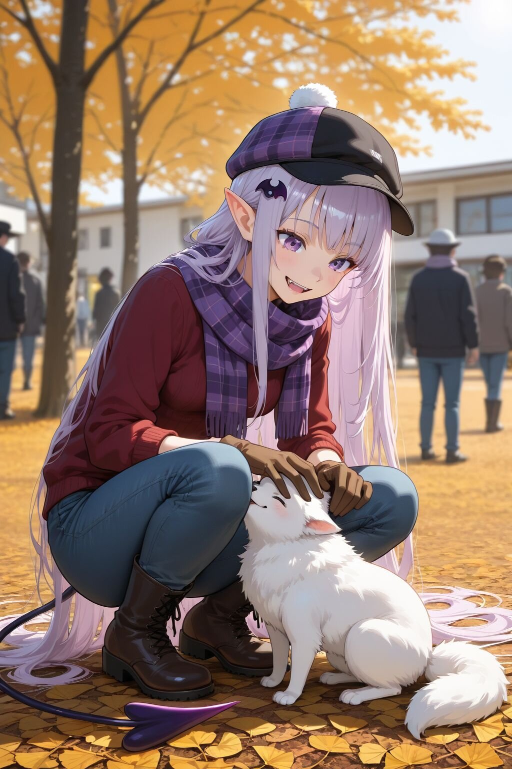 straight hair, medium bangs, naturally flowing hair, left hair ornament, Light purple hair, very long hair, purple eyes, pointy ears, fangs, small breasts, purple demon tail, photo background, bokeh, blurry background, depth of field, (photo body:0.3), Knitwear, Men's, Gloves, Tartan, Boots, Animal, Holding an animal, petting an animal, Fluffy, Denim, Scarves, Hats, autumn, squatting down,