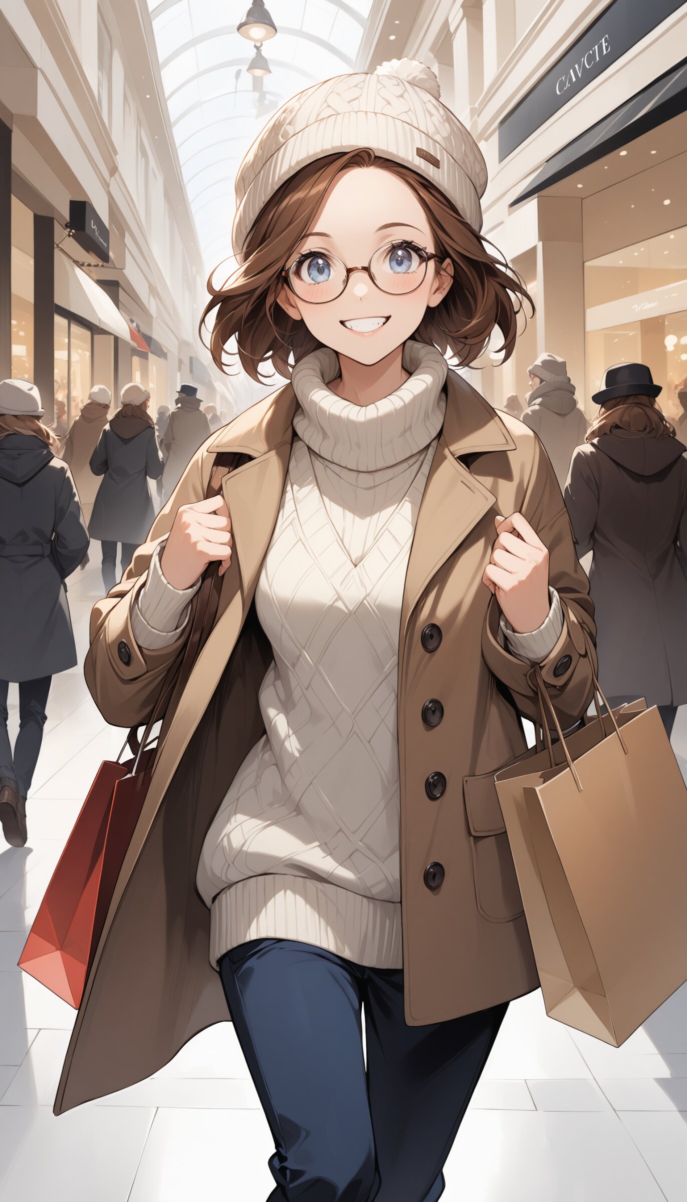 woman, short hair, brown hair, forehead, glasses, hat, pants, shopping street, smile, mall, dynamic angle, dynamic action, date, happy, grin, coat
