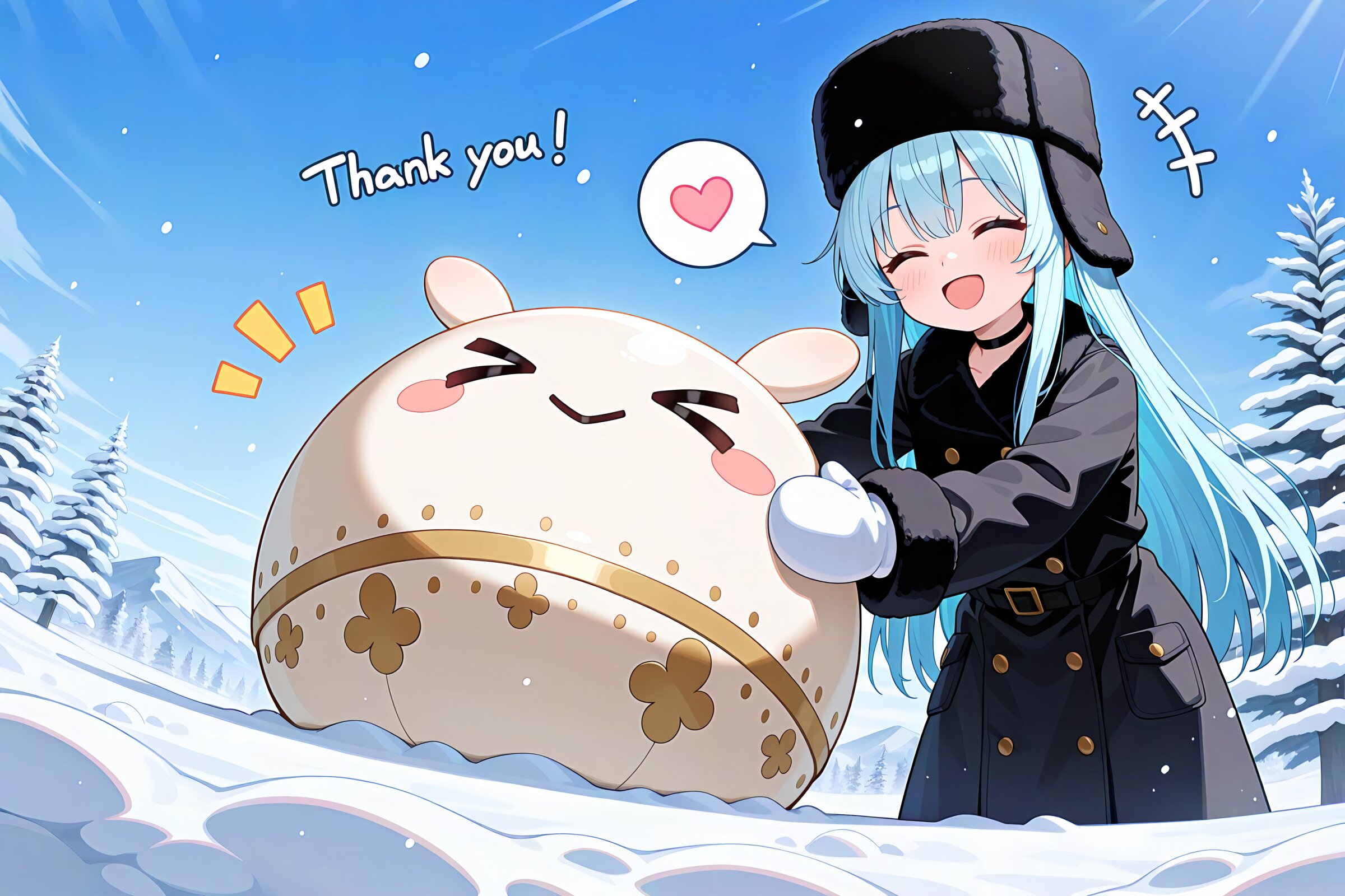1 little girl, solo, diagonal angle, masterpiece, best quality, amazing quality, very aesthetic, sky blue hair, long hair, straight hair, closed eyes, open mouth, smile, cheerful, +++, notice lines, choker, black long fur coat, black russian fur hat, white fur mittens, spoken heart, thank you, holding humpty dumpty, > <, winter, snow,