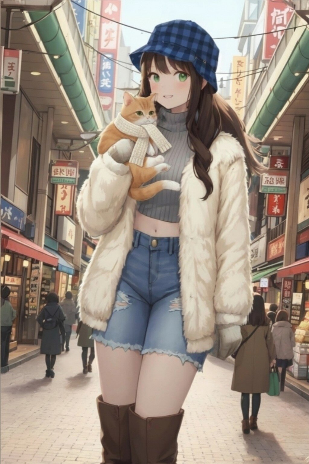 A cute anime girl with long brown hair and green eyes, smiling gently, holding a ginger cat in her arms, walking in a bustling Japanese shopping street (shotengai). She is wearing a cream-colored fuzzy fur jacket, a grey cropped turtleneck knit top, ripped denim shorts, and long brown boots. On her head, she has a blue plaid bucket hat. The street is filled with people, shops with red awnings, and colorful Japanese signs and lanterns, with tall buildings in the background under a clear sky. Daytime.