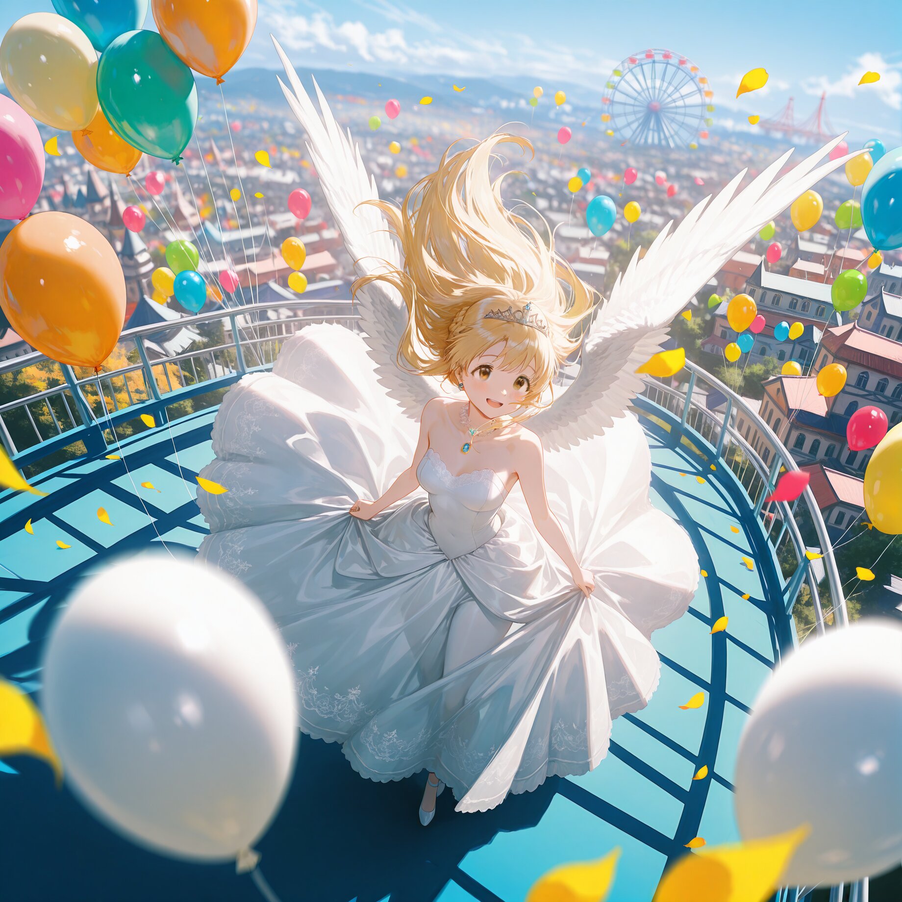 (colorful theme:1.6),masterpiece, best quality, absurdres, 8k, ultra detailed, aesthetic, very aesthetic, newest, <lora:Fixhands_anime_bdsqlsz_V1:0.5>, <lora:bold-16oa:-0.5>, (realistic:0.3),BREAK (shallow depth of field,Gaussian Blur:1.6),1girl,beautiful blue sky,maginificient views, cute girl with blonde hair and brown eyes, riding a roller coaster at an amusement park, wind blowing her hair, joyful expression, smiling, dynamic composition, motion blur, speed effect,colorful background with other attractions, ferris wheel, balloons,bright daylight, vivid lighting, soft shadows,sparkling atmosphere, cinematic perspective,highly detailed, skin reflection, vibrant tones,(happy:1.3) ,(smile,tareme:1.3),(wearing a luxurious white ball gown style wedding dress, princess silhouette, richly decorated with ornate lace,jewels:1.0),blonde hair, long hair, brown eyes, (white angel wings:1.2),tiara,braid,(standing,from above:1.3),,open mouth,(fullbody shot,wide angle,wide shot,colorful petals,colorful balloon:1.3),(medium breasts,curvy:1.3),<lora:USNR STYLE_XL_loha:0.8>