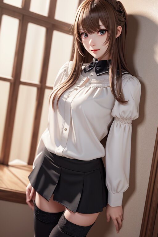 masterpiece, hyper detailed, 8K, hyper detailed illustration,extremely detailed CG, Japanese woman, 23yo, cute, pretty, hyper detailed face, hyper detailed eye, beautiful eye, extremely detailed, medium hair,bangs, thin, tall, perfect anatomy, perfect proportions, extremely detailed body, blouse, short skirt, (thighhighs:1.50), simple background,