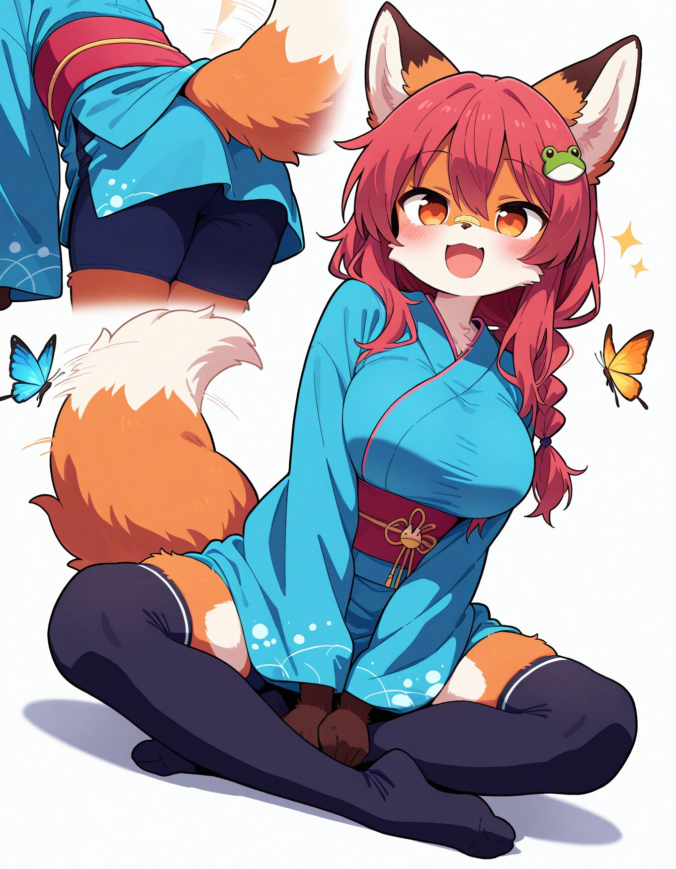 1girl, (short size:1.2), oppai loli, (red fox girl), (furry female), fur tuft, fluffy body fur, stand fur, thick fur, fox nose, snout, red fox ears, red fox tail, fluffy tail, fox paws, (large breasts), slim, bandaid on nose, red hair, long hair, low ponytail, single braid, frog hairclip, hair between eyes, orange eyes, smile, light open mouth, blue kimono, short kimono, wide sleeves, obi, black bike shorts, taut shorts, zettairyouiki, black over-kneehighs, skindentation, deep skin, light-open mouth, tail wagging, motion lines, motion blur, motion trail, afterimage, smear frame, invisible floor, midair, flying butterfly, indian style, v arms, solo focus, from front, three-quarter view, white background, ((high contrast)), (stylized), (kawaii), (cute), softy, (cel shading), (cel rendering), (2D), furry, (two tone fur), (furry body), perfect body, detailed face, high quality, cute clothes, animal tail, animal ears, masterpiece, ((correct_anatomy)), close-up, (detailed_hands:1.5), lolitaaa, small body, short girl, petite, very short, tiny, A girl, no lines, simple style, vibrant colors, good light, paint style