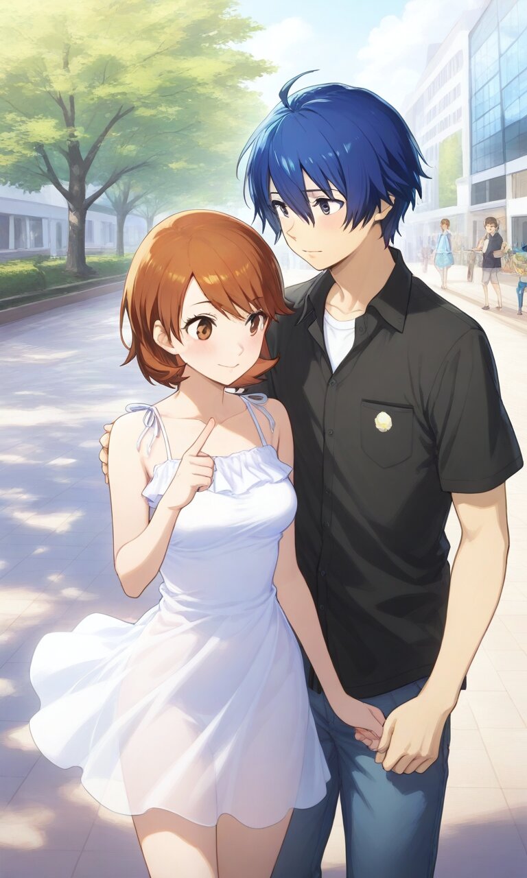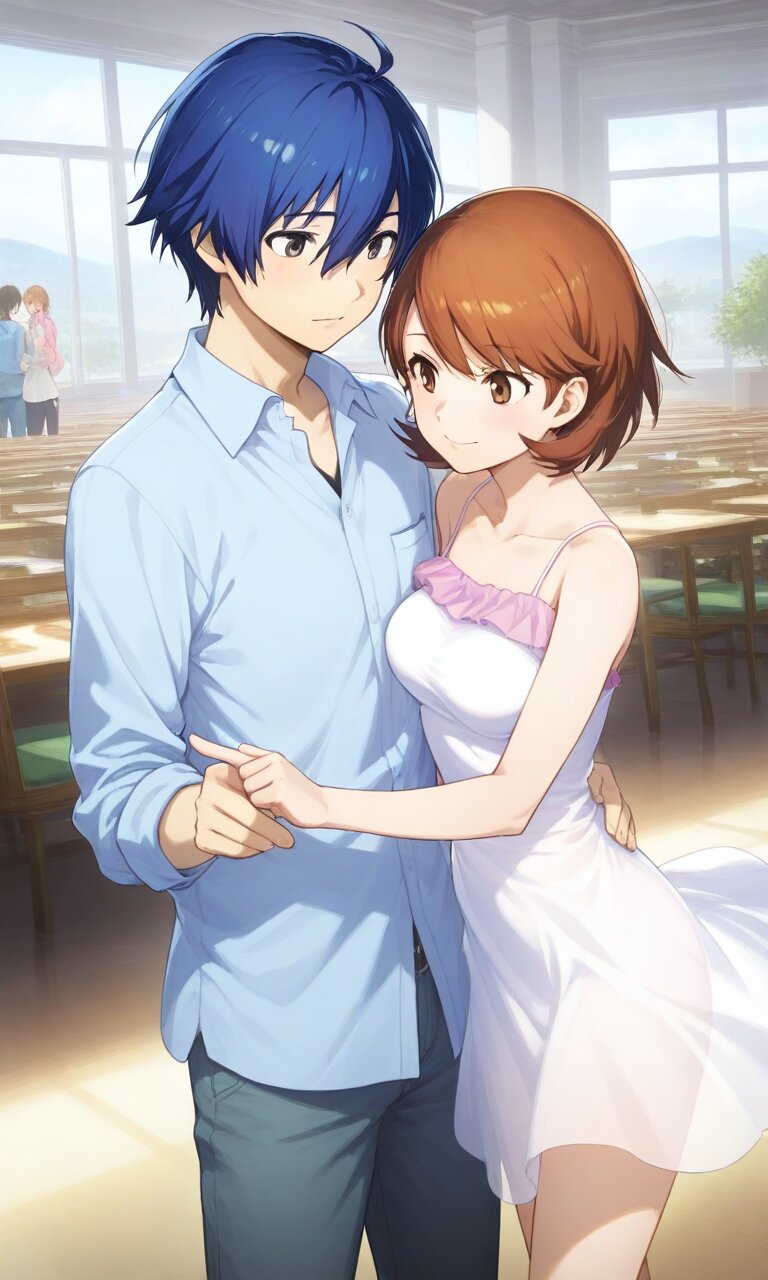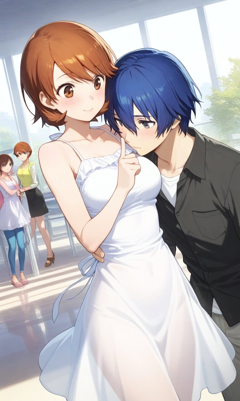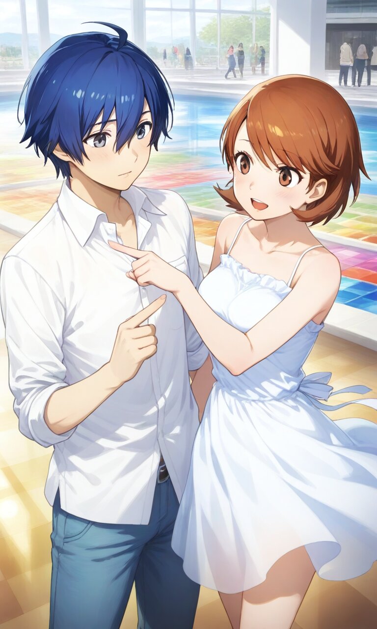 Couple, boy and girl, two people only,absurdres, ultra-detailed, master piece, high resolution, 8k, Boy, girl, couple, masterpiece, best quality, extremely detailed, couple standing close, woman in colorful sundress, man in casual shirt, pointing at surreal sculpture, vibrant art museum with rainbow-colored installations, reflective floors, bright natural light through windows, perfect anatomy BREAK the boy(yuuki makoto, blue hair, gray eyes, 1 boy , ) BREAK the girl(yukari takeba, short hair, light brown hair, brown eyes, large breaths,)