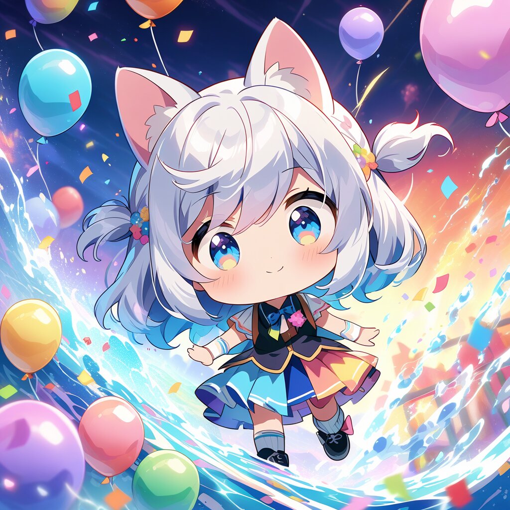 Shiny silver paint line drawings, colorful balloons and sharp gusts of magic, fire, water, lightning, wind, endless flowers and flying confetti, concert venues, school gates, reversing camera lenses, fisheye lenses, close-ups of cosplay girls with cat ears and tails, and enchanting colorful and silvery backgrounds.(anime style) (familiar face)chibi style.