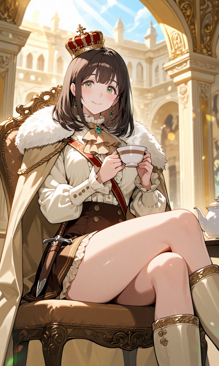 A mature woman in her 40s with a delicate, cute face and light green tareme eyes. She has dark brown medium-length straight hair with long bangs, styled in intricate detail. Her body is realistically proportioned with medium breasts, wearing an (off-white luxurious prince costume:1.4) with long sleeves, a (beige luxurious cape:1.2), and a (brown luxurious mini skirt:1.4). Accessories include a (luxurious crown:1.2), a (beige frilled jabot), and a (dagger on waist:1.3). Her outfit is completed with ivory luxurious boots. She sits on a (luxurious chair:1.5) with her knees crossed, holding a coffee cup, exuding a shy yet warm smile. The background features rococo palace architecture with golden accents, bathed in soft afternoon sunlight with lens flare and bloom effects. The romantic atmosphere is enhanced by intricate details, anti-aliasing, and a blissful mood, rendered in a highly detailed illustration style.
