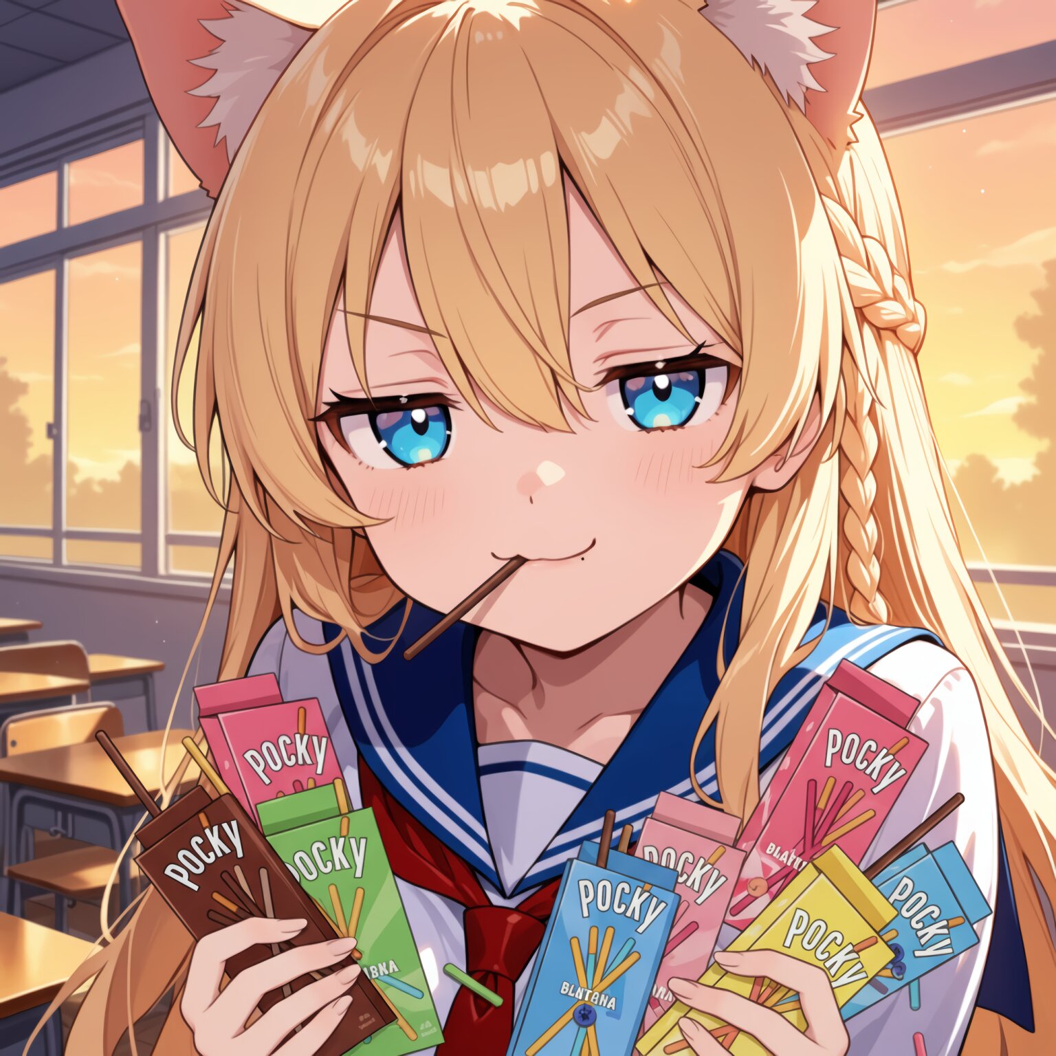 1girl, blue eyes, blonde cat ears, long hair, blonde hair, braid, hair between eyes, medium breasts, :3, open mouth, looking at viewer, jitome, smile, straight brow, eating Pocky sticks, holding many colorful Pocky boxes and sticks in both hands: chocolate, strawberry, matcha, banana, blueberry flavors. school classroom, evening,