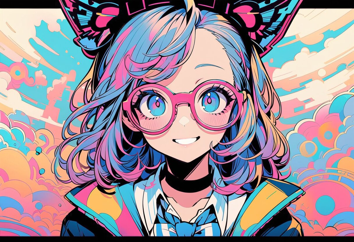 私の髪も、メガネも、全部パステルネオンに染まってるの!ピンクとブルーって、なんでこんなに元気が出る色なんだろう?このネコミミ風のヘッドギアも、私のとっておきのオシャレアイテム!✨