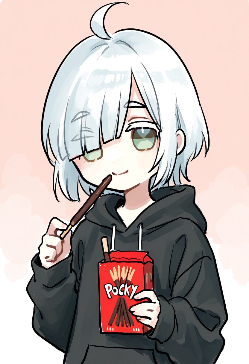 <lora:inmnstyleilxl:0.9>, best quality, masterpiece, very aesthetic, watercolor painting, general, 1girl, chibi, solo, (bright white hair), short hair, blunt bangs, white thick eyebrow, white colored eyelashes, (hair over one eye), ahoge, mintgreen eyes, oversize black hoodie, sleeves past wrists, holding pocky, smile, upper body