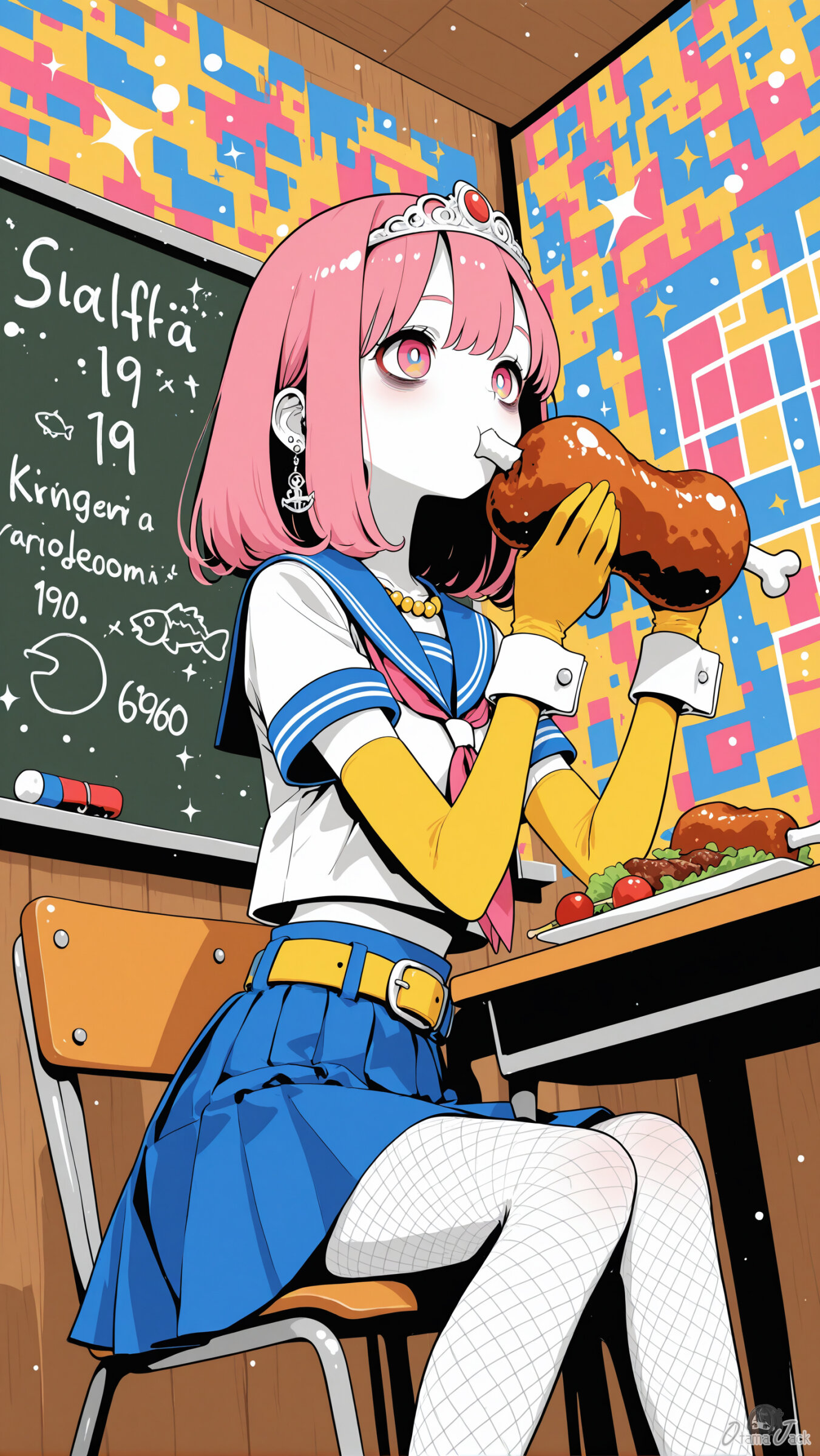 1960's hippie modern living room,( California 1960's Peter Max geometric pattern wall:1.2), psychedelic poster,(geometric pattern background:1.2), Dragon Quest, belt, circlet, yellow gloves, elbow gloves, sailor suit, fishnet stockings, Wooden desk, sitting on a chair,School festival, fish on a skewer, boned meat, holding, food, eating, holding food, Classroom, fantasy Classroom, Dragon Quest style Classroom, Flooring, wooden wall, indoor, Chalk illustration on a blackboard,blackboard,