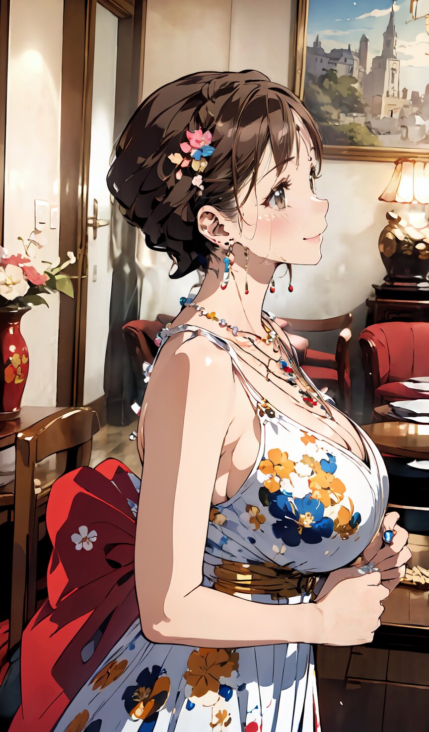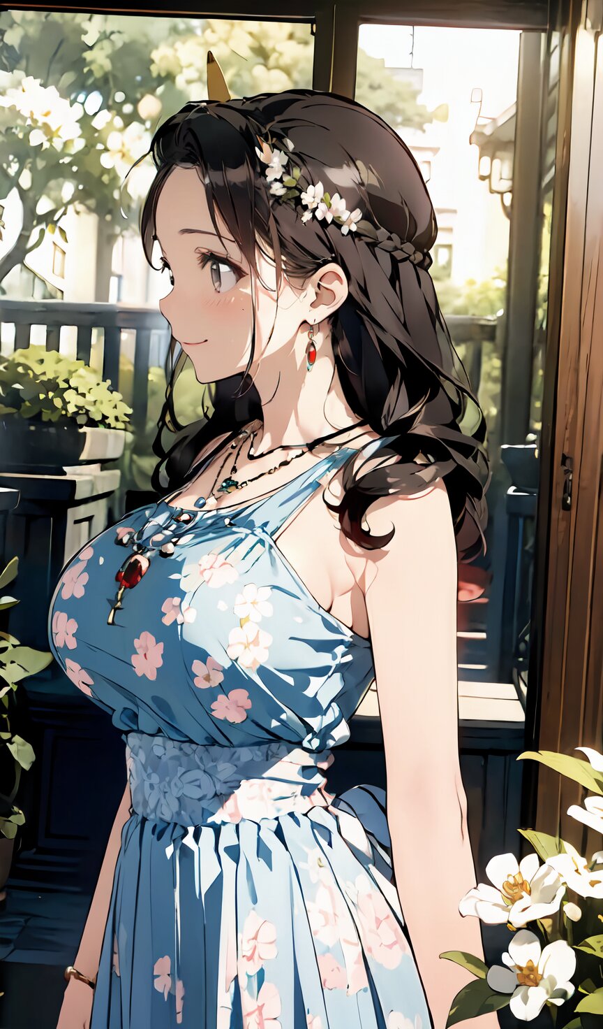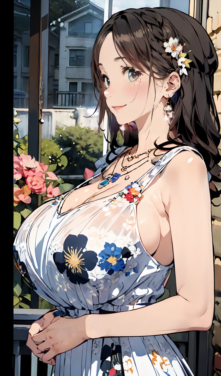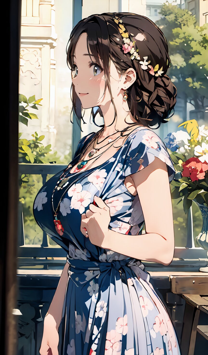 (upper body, random angle: 1.6), (8k, best quality, masterpiece:1.4), (realistic, photo-realistic:1.6), HDR, (incredibly absurdres:1.2), (vibrant color:1.2), ultra-detailed, 1woman, solo, 48 years old, slender, (saggy gigantic breasts: 1.8), long hair, perfect body, highly detailed, shiny hair, looking at viewer, (Floral Vintage Dress Elegant Midi Evening Dress, necklace and earrings: 1.6), (standing: 1.2), in the bright sunroom, <lora:shima_v05:1>