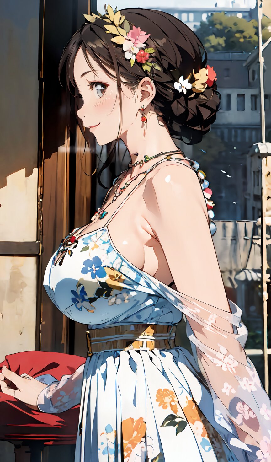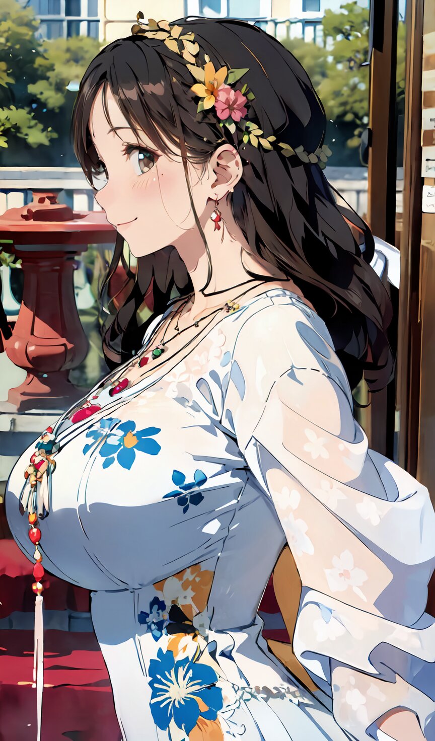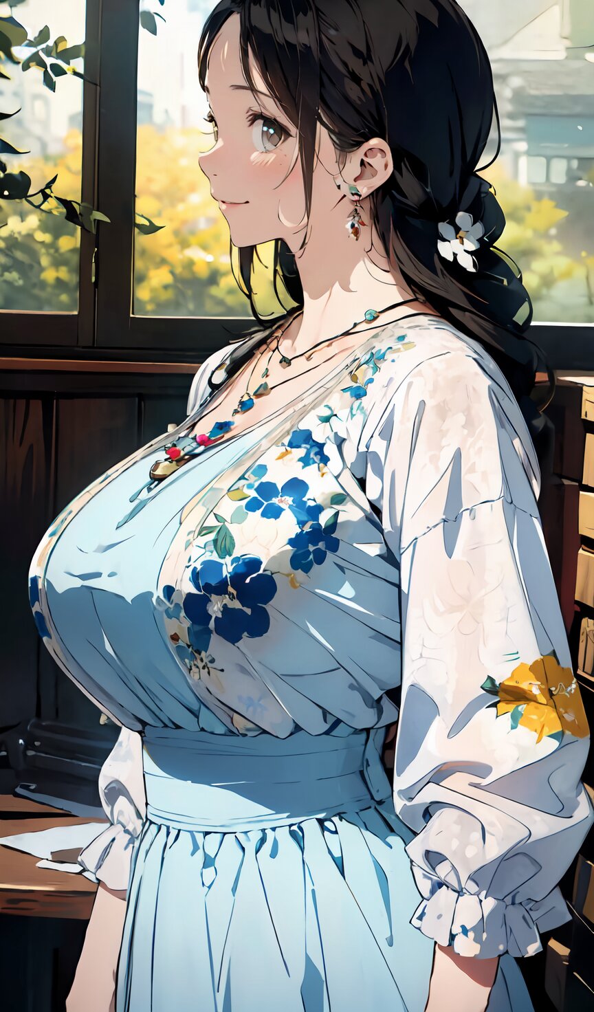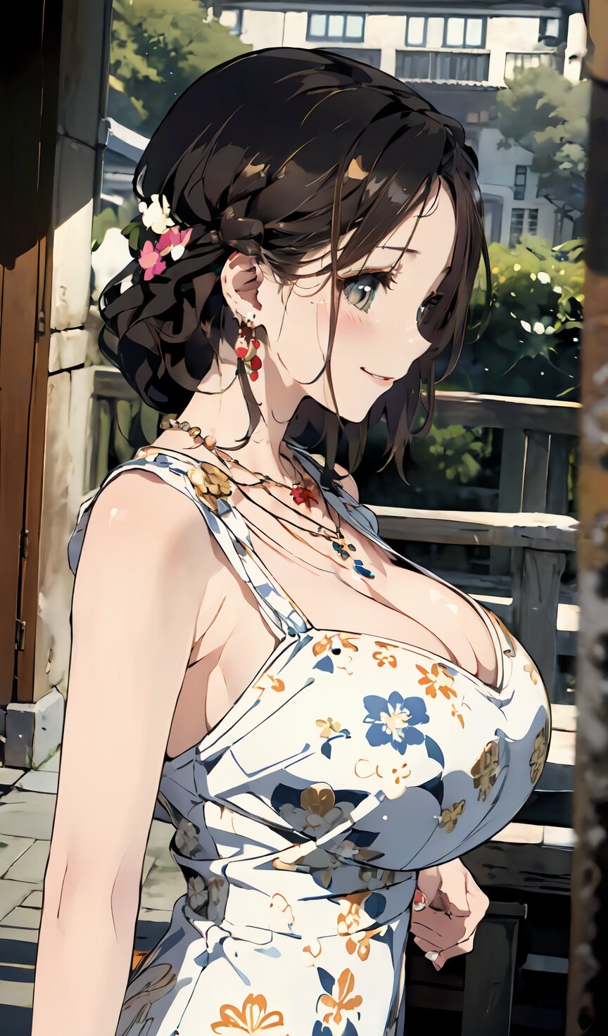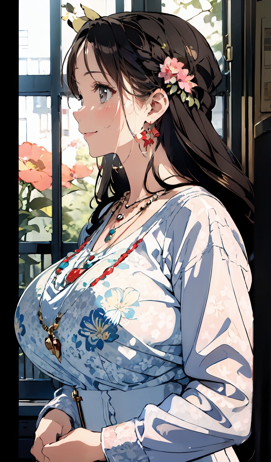 (upper body, random angle: 1.6), (8k, best quality, masterpiece:1.4), (realistic, photo-realistic:1.6), HDR, (incredibly absurdres:1.2), (vibrant color:1.2), ultra-detailed, 1woman, solo, 48 years old, slender, (saggy gigantic breasts: 1.8), long hair, perfect body, highly detailed, shiny hair, looking at viewer, (Floral Vintage Dress Elegant Midi Evening Dress, necklace and earrings: 1.6), (standing: 1.2), in the bright sunroom, <lora:shima_v05:1>