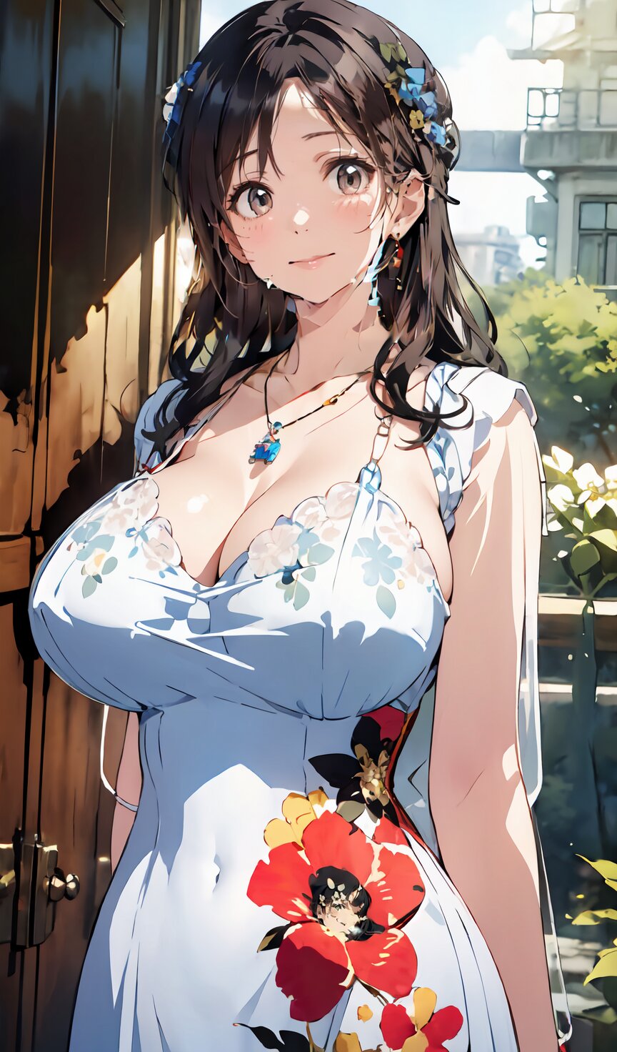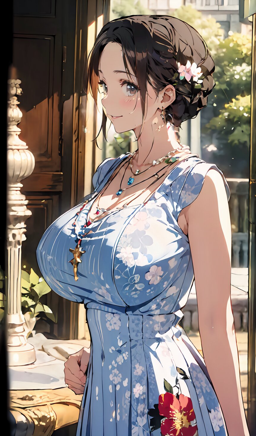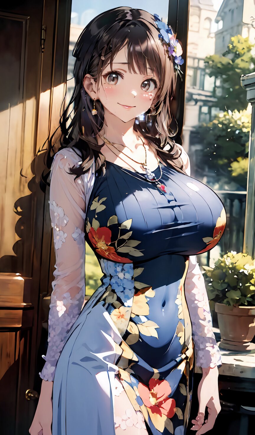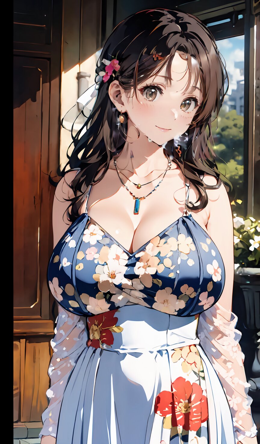 (upper body, from front: 1.6), (8k, best quality, masterpiece:1.4), (realistic, photo-realistic:1.6), HDR, (incredibly absurdres:1.2), (vibrant color:1.2), ultra-detailed, 1woman, solo, 48 years old, slender, (saggy gigantic breasts: 1.8), long hair, perfect body, highly detailed, shiny hair, looking at viewer, (Floral Vintage Dress Elegant Midi Evening Dress, necklace and earrings: 1.6), (standing: 1.2), in the bright sunroom, <lora:shima_v05:1>
