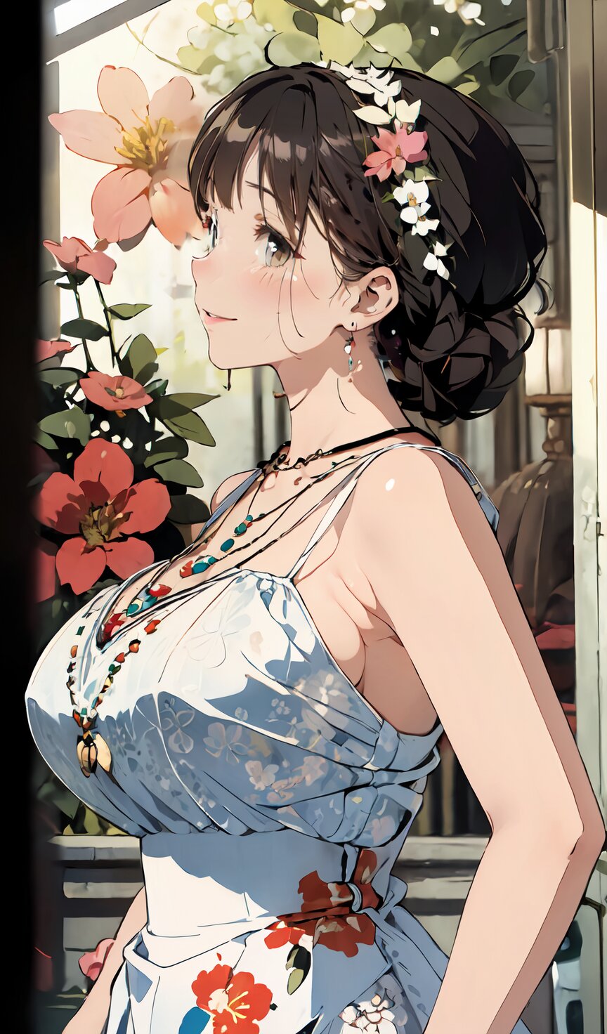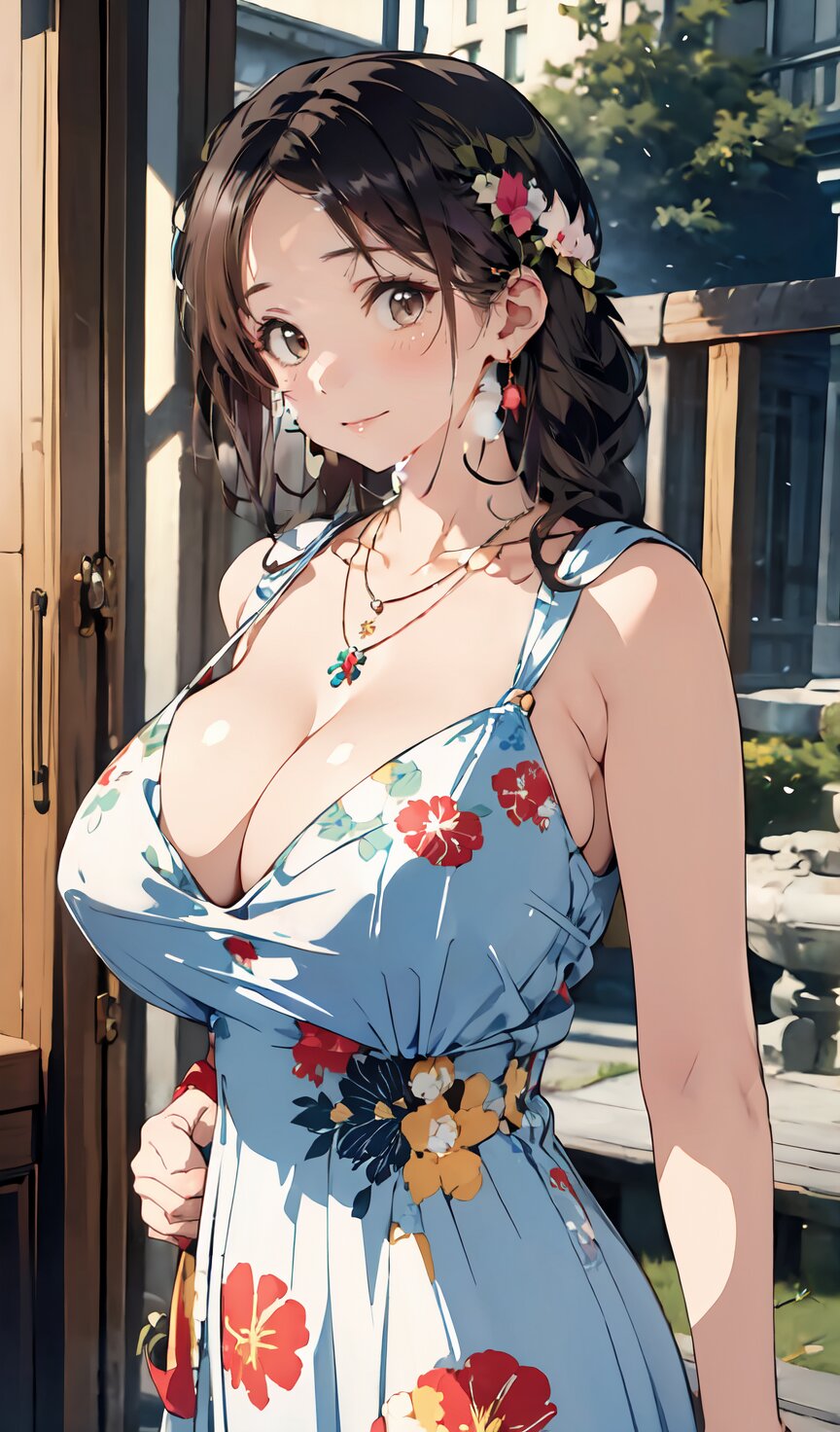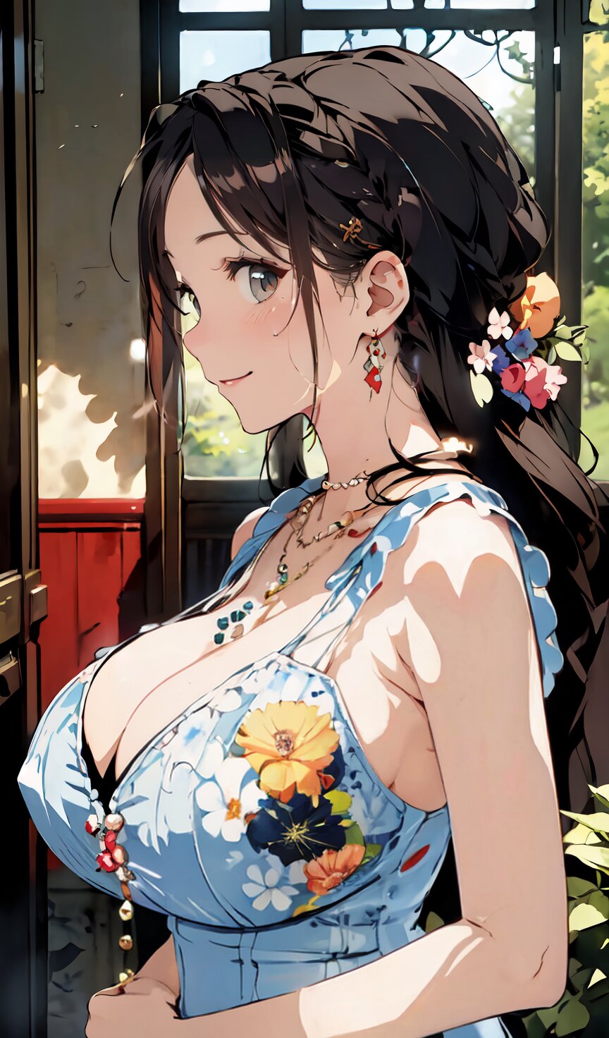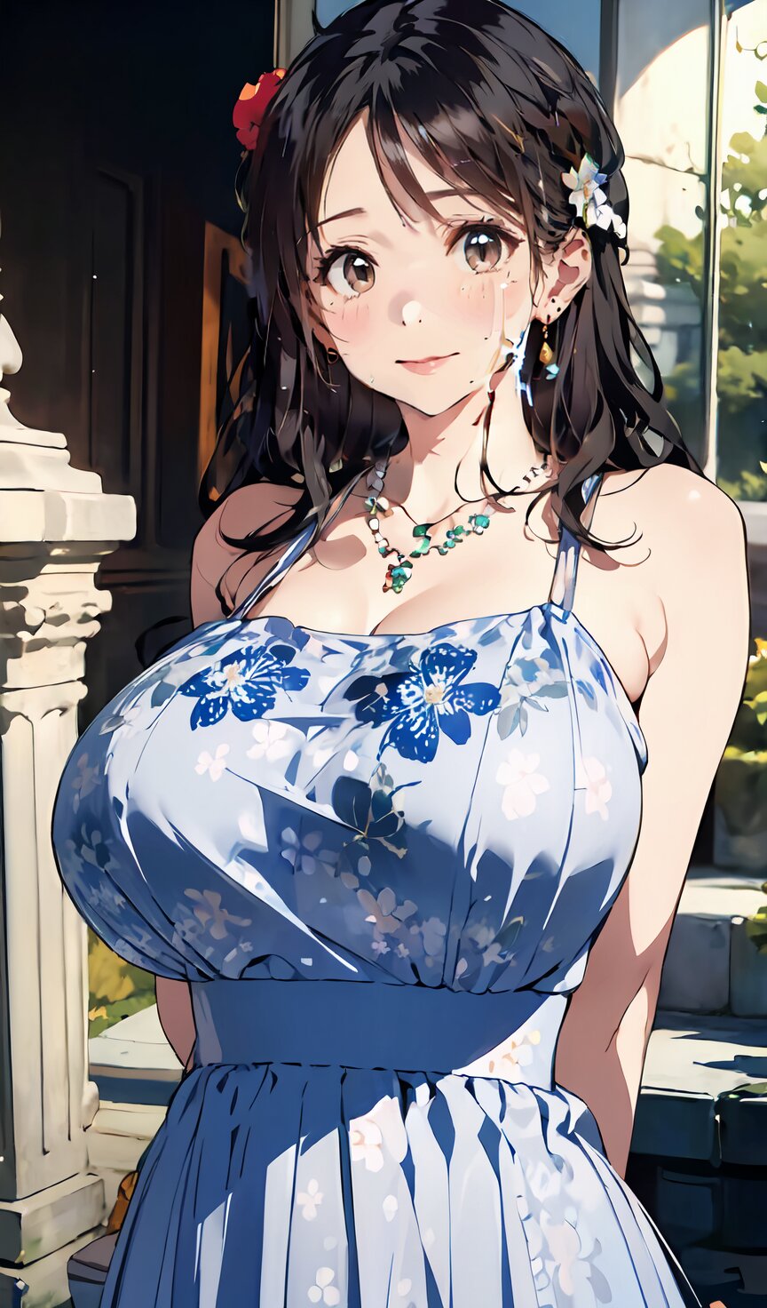 (upper body, from front: 1.6), (8k, best quality, masterpiece:1.4), (realistic, photo-realistic:1.6), HDR, (incredibly absurdres:1.2), (vibrant color:1.2), ultra-detailed, 1woman, solo, 48 years old, slender, (saggy gigantic breasts: 1.8), long hair, perfect body, highly detailed, shiny hair, looking at viewer, (Floral Vintage Dress Elegant Midi Evening Dress, necklace and earrings: 1.6), (standing: 1.2), in the bright sunroom, <lora:shima_v05:1>