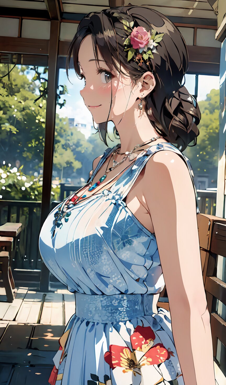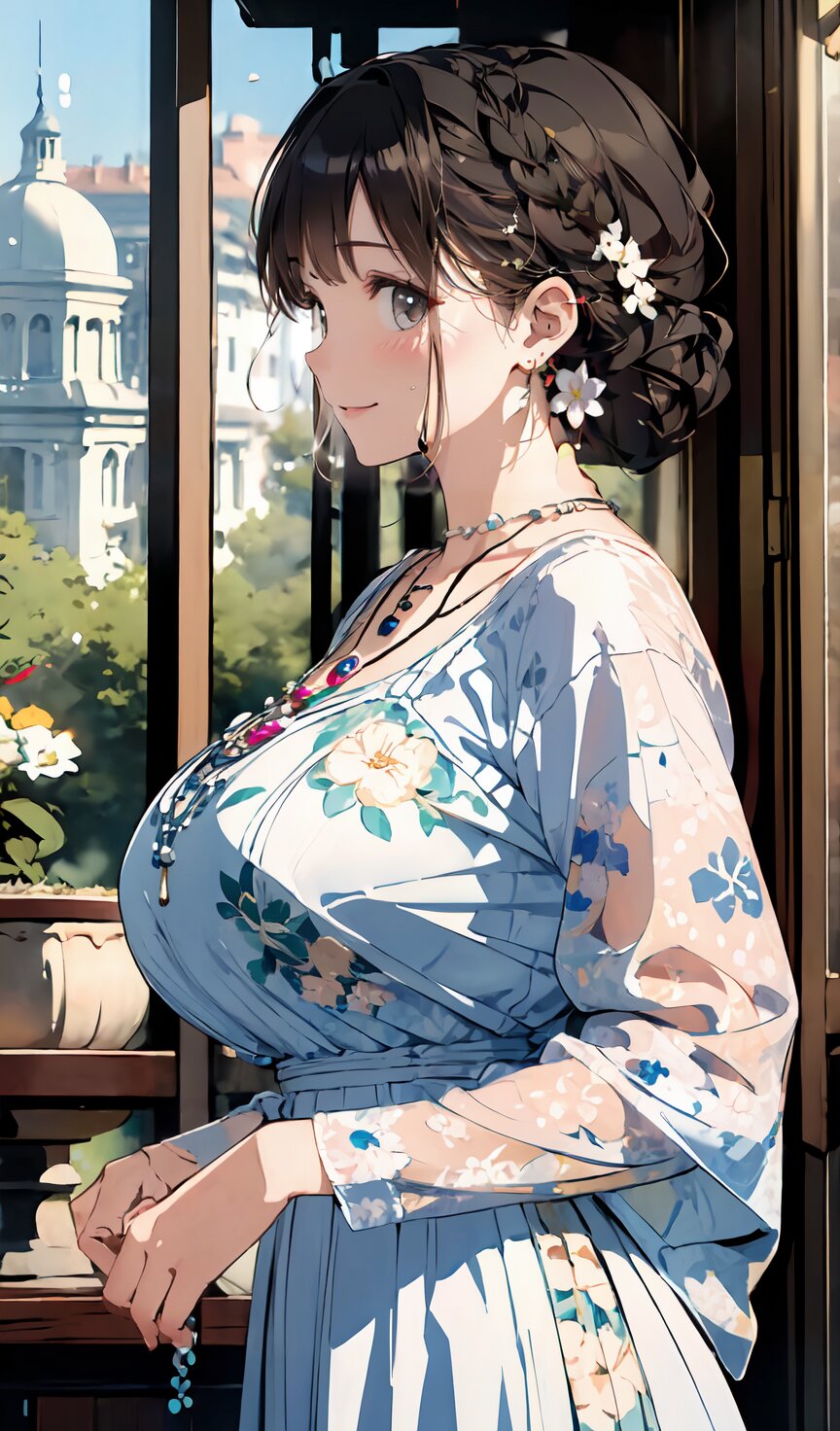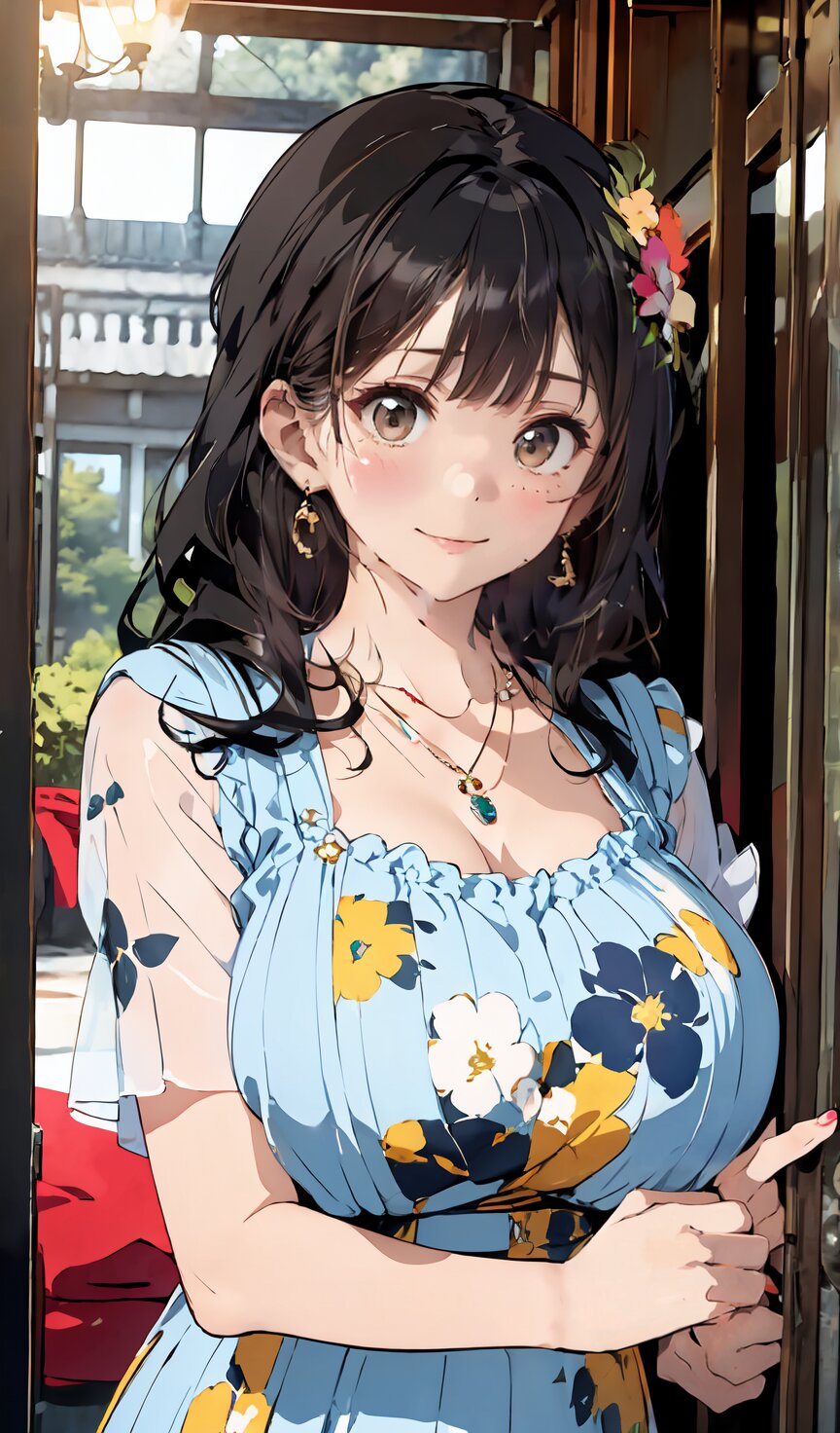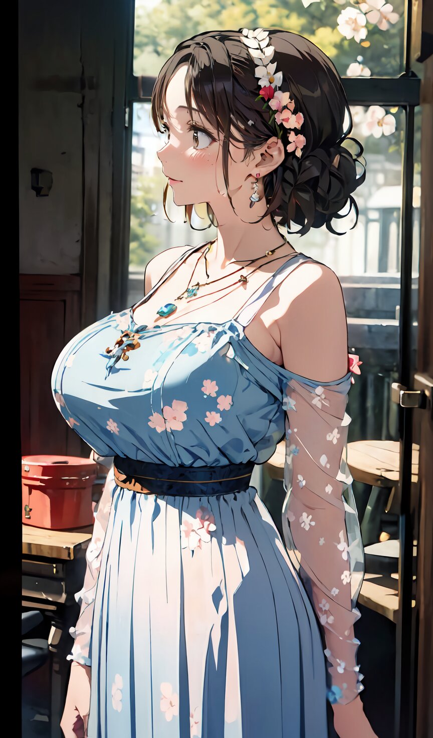 (upper body, from front: 1.6), (8k, best quality, masterpiece:1.4), (realistic, photo-realistic:1.6), HDR, (incredibly absurdres:1.2), (vibrant color:1.2), ultra-detailed, 1woman, solo, 48 years old, slender, (saggy gigantic breasts: 1.8), long hair, perfect body, highly detailed, shiny hair, looking at viewer, (Floral Vintage Dress Elegant Midi Evening Dress, necklace and earrings: 1.6), (standing: 1.2), in the bright sunroom, <lora:shima_v05:1>
