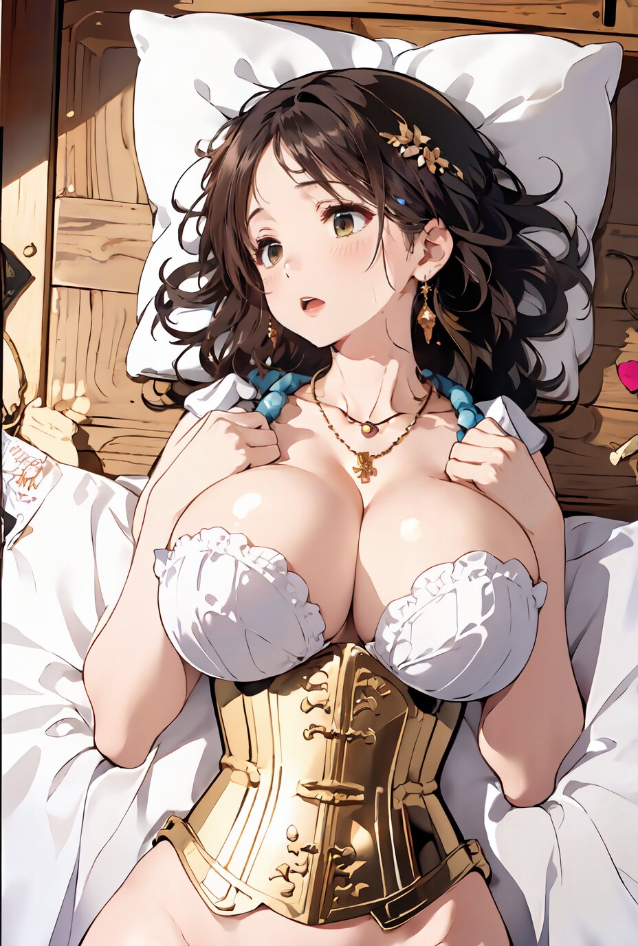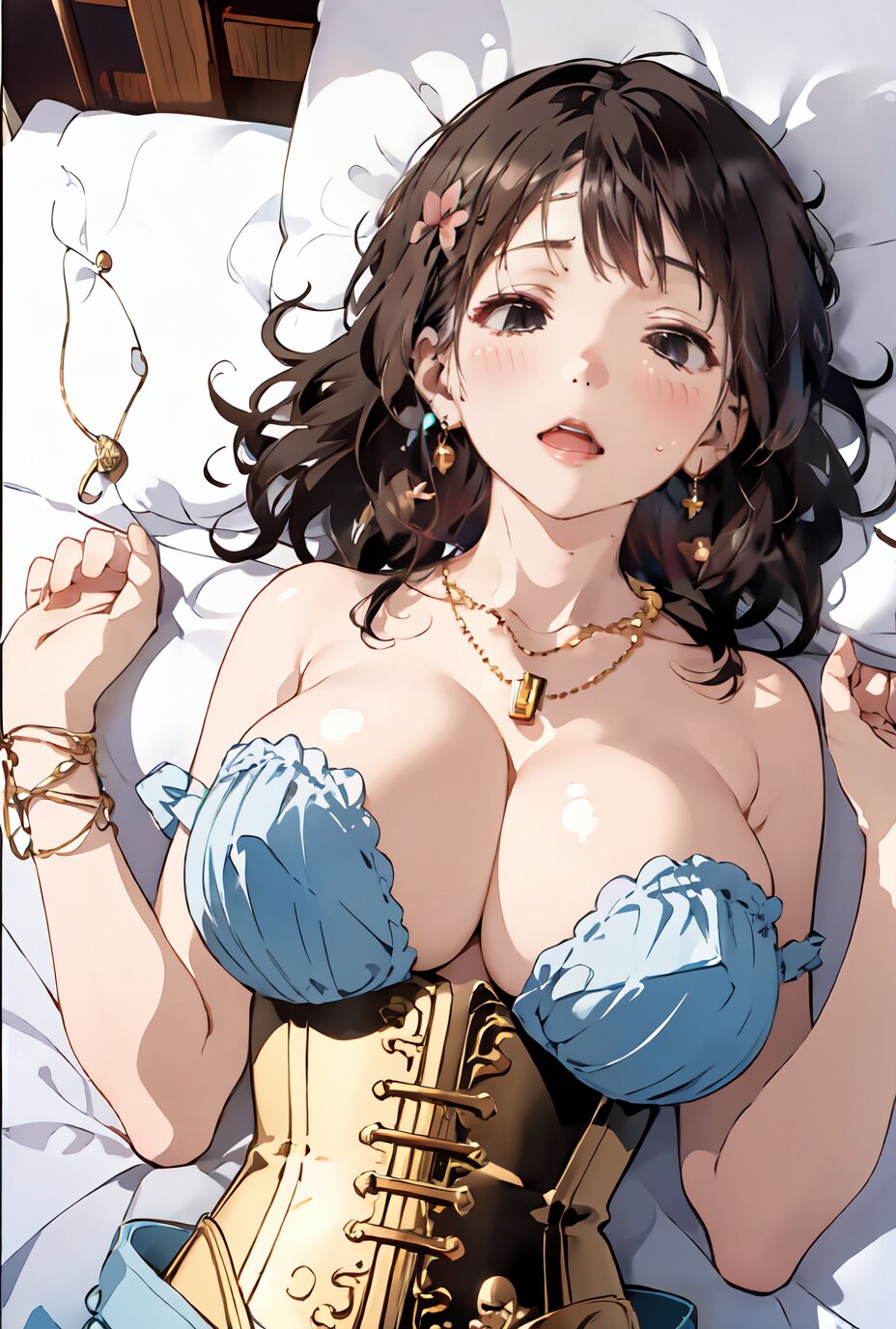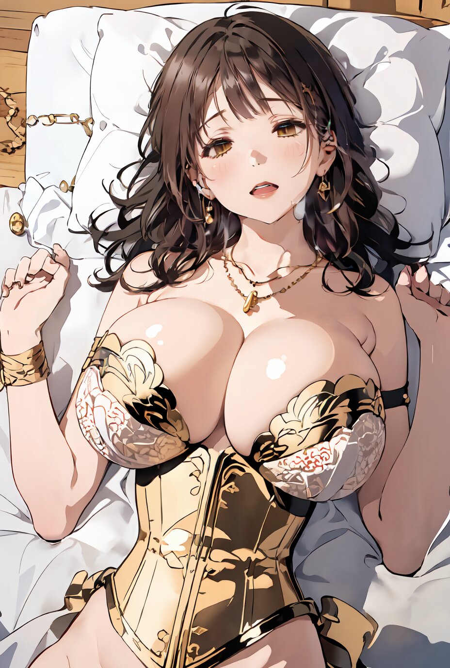 nsfw, (nude: 1.4), (upper body: 1.6), (from above: 1.4), (8k, best quality, masterpiece:1.4), (realistic, photo-realistic:1.6), HDR, (incredibly absurdres:1.2), (vibrant color:1.2), ultra-detailed, 1woman, solo, 48 years old, slender, beautiful nipple, (saggy gigantic breasts: 1.8), long hair, perfect body, highly detailed, shiny hair, looking at viewer, (gold corset, necklace and earrings: 1.6), (lying on bed, on back: 1.2), in the bedroom, <lora:shima_v05:1>