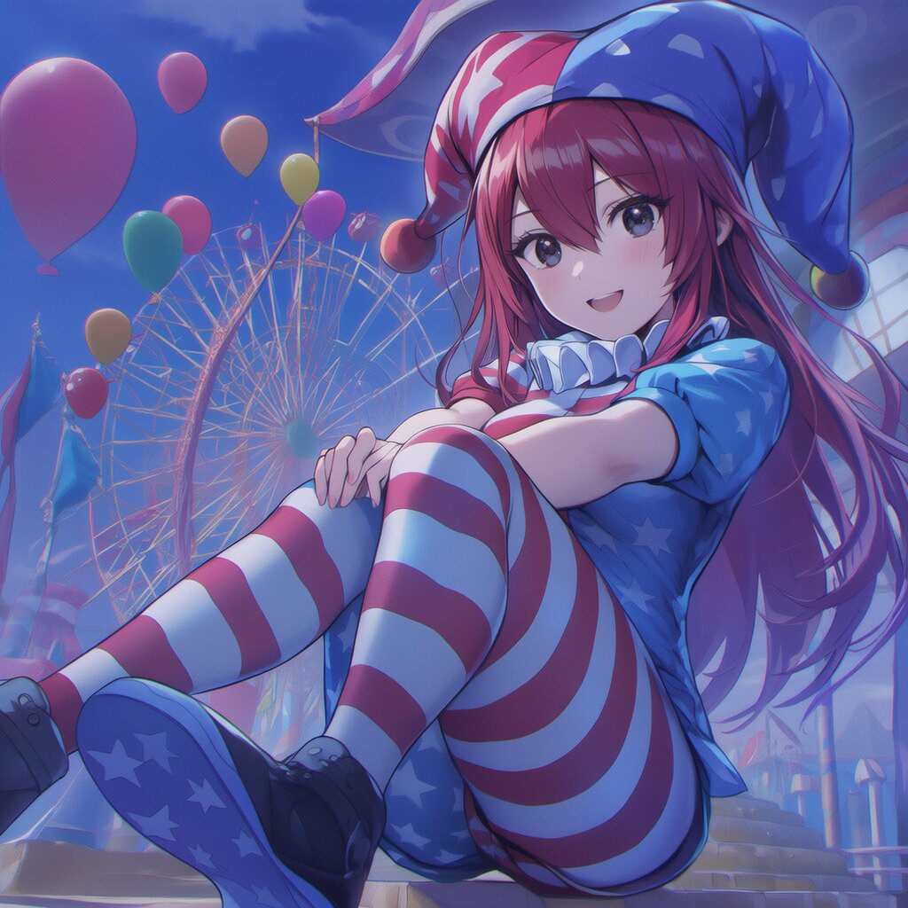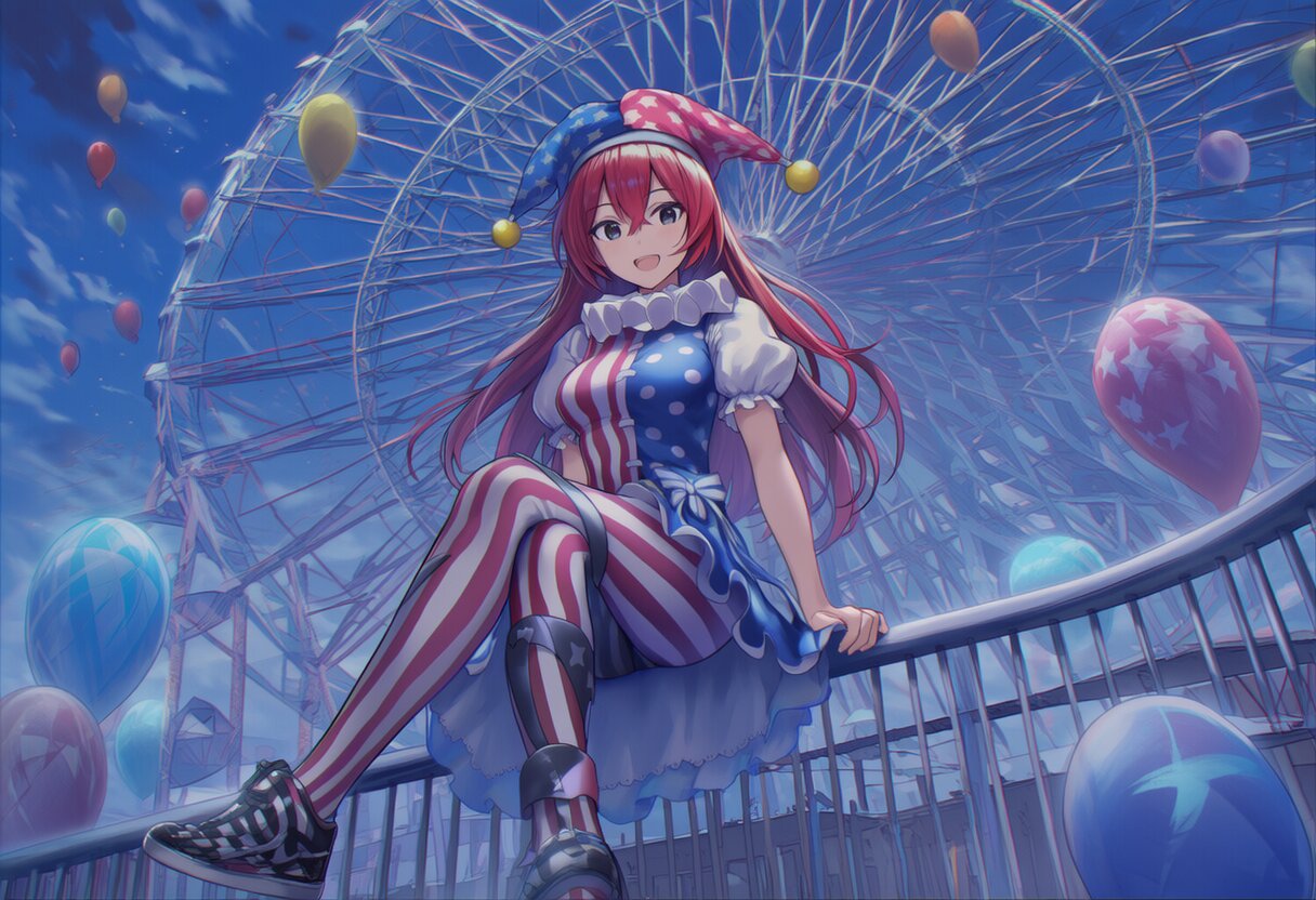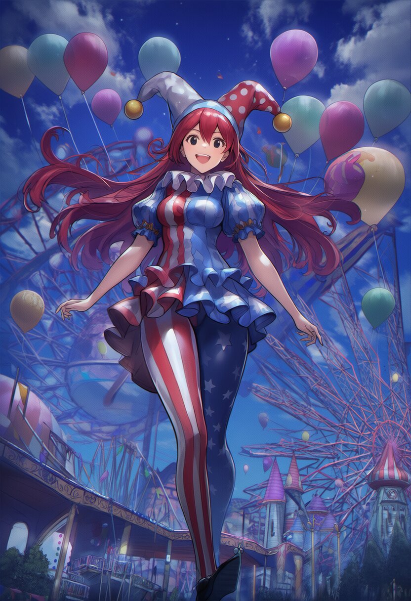 {{{highly detailed}}}, {{official style}}, {100-layer}, {{{ultra-high resolution}}}, {{{hi-vision anime}}}, {{intricate}}, {{{detailed beautiful eyes, detailed beautiful face, detailed beautiful face and eyes}}}, 1girl, solo, black eyes, long hair, straight hair, red hair, hair between eyes, medium breasts, happy, smile, clown piece, american flag legwear, american flag footwear, black footwear, jester cap, polka dot, neck ruff, short sleeves, pantyhose, hat, blue sky, amusement park, balloon, circus, outdoors, {{{masterpiece}}}, {{{best quality}}}, {{{very aesthetic}}}, {{{ultra-detailed}}}, {illustration}, {{{extremely detailed}}}, {{{an extremely delicate and beautiful}}}