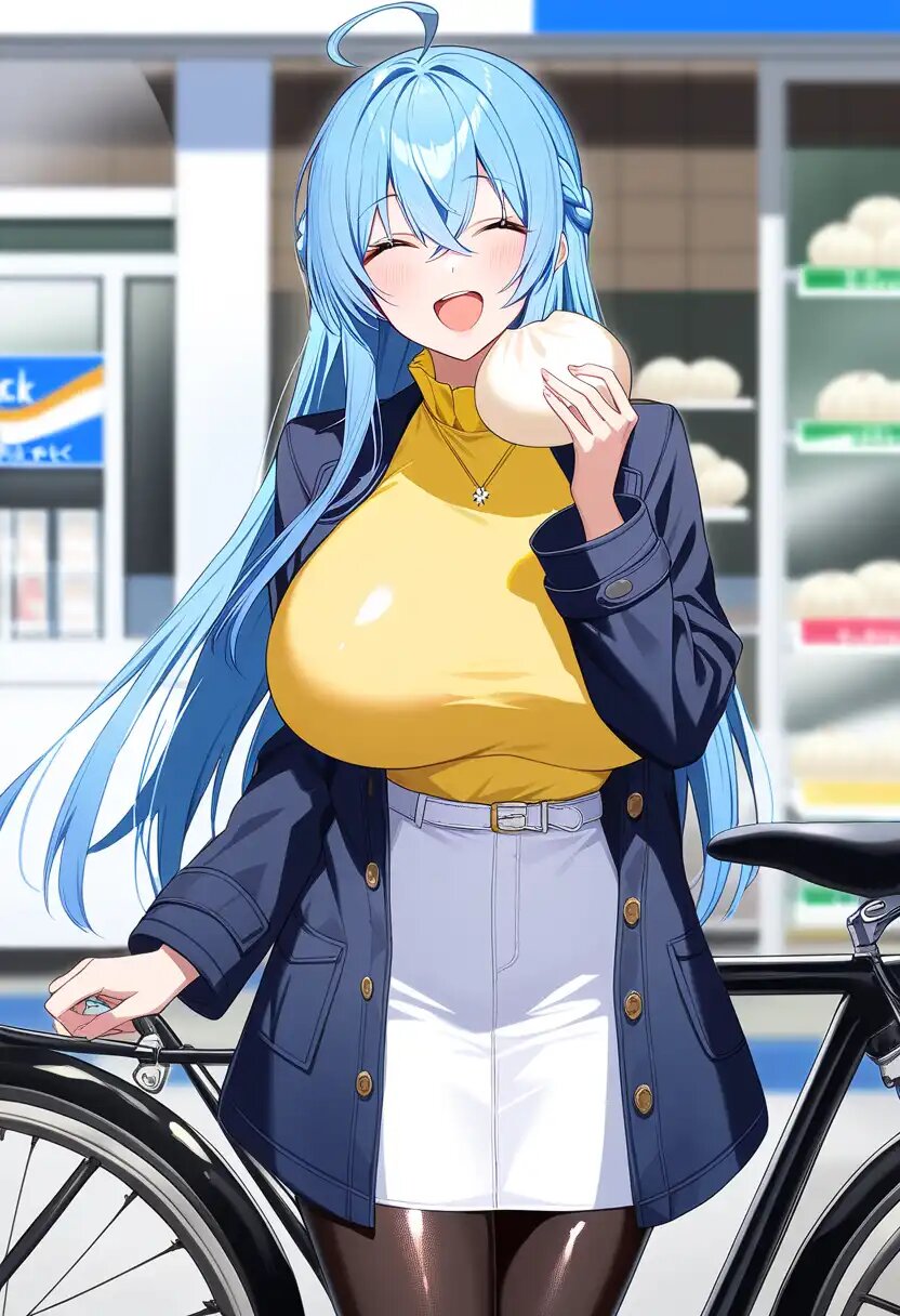 [eating baozi]++, [holding baozi]++, [open coat]+, [yellow tops]++, [casual]++, [white skirt]++, [huge breasts]++, perky breasts, hanging breasts, curvy, BREAK [black pantyhose]++, cowboy shot, legs together, standing, BREAK tall, [long hair]++, [straight hair]++, [shiny]++, [shiny skin]++, [shiny clothes]++, smile, blush, closed eyes, open mouth, BREAK [In front of the convenience store]++, bicycle, day, outdoors,