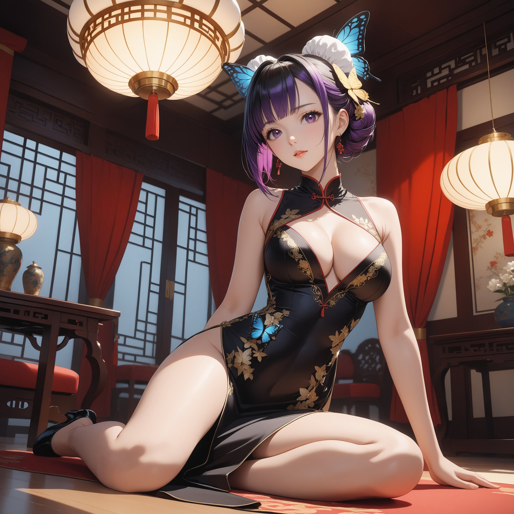 masterpiece, best quality, photorealistic, sharp focus, cinematic lighting, depth of field, beautiful composition, vibrant colors, ultra high res, 8K, highly detailed, masterpiece, best quality, very detailed, masterpiece, best quality, highres, shinobu kochou, black hair, butterfly, butterfly hair ornament, forehead, gradient hair, hair ornament, multicolored hair, parted bangs, purple hair, short hair, two-tone hair, bun cover, luxurious china dress, form-fitting, gold accents, sleeveless, deep cleavage, strategic cutouts, confident, indoors, elegant setting, full body, seated on the floor, low perspective, bare legs extended, cleavage emphasized, alluring, from a worm's eye view, elegant posture