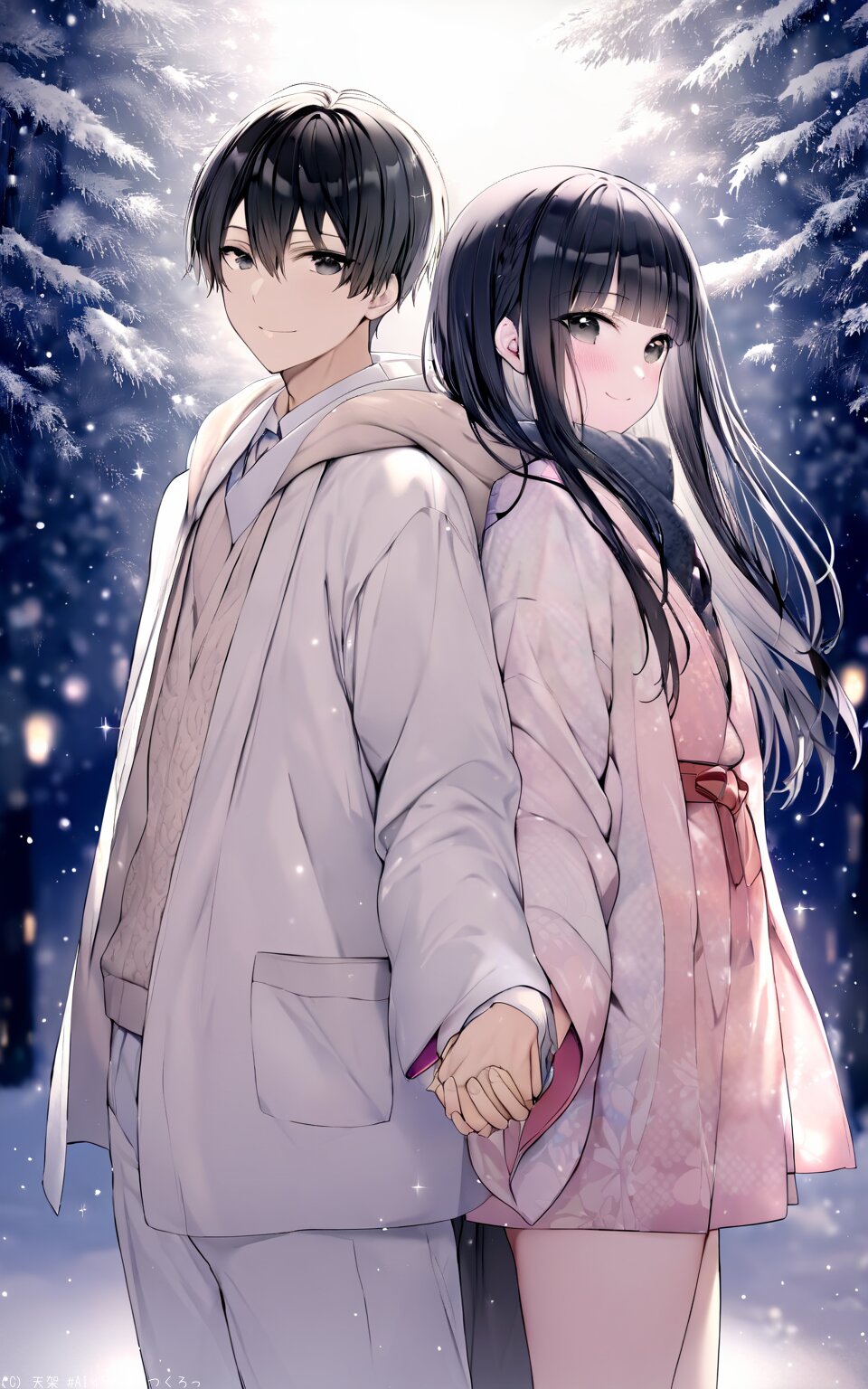 (best quality),(masterpiece),(ultra detailed),Water color Illust,absurdres,hires,ultra detailed, high resolution hires, best quality, master piece,Winter Illust, Cute 1Girl,and bishounen male 16years old, ,black hair, hime cut, long straight hair, black eyes, Slim body, Japanese clothes(red Furisode kimono hood haori uchikake),shiny hair silky hair, sparkle (Effect), blown by the wind, haori jacket, short kimono coat, layered over kimono, subtle lining pattern, elegant outerwear,A romantic winter date scene featuring a cute girl and her(Boyfriend) partner. They are dressed warmly in stylish winter clothing, such as cozy sweaters, scarves, and hats. The setting is a snowy outdoor environment, perhaps a park or city street decorated with holiday lights and ornaments. They are holding hands, smiling, and enjoying the winter atmosphere. The background includes snow-covered trees, twinkling lights, and a warm, inviting ambiance