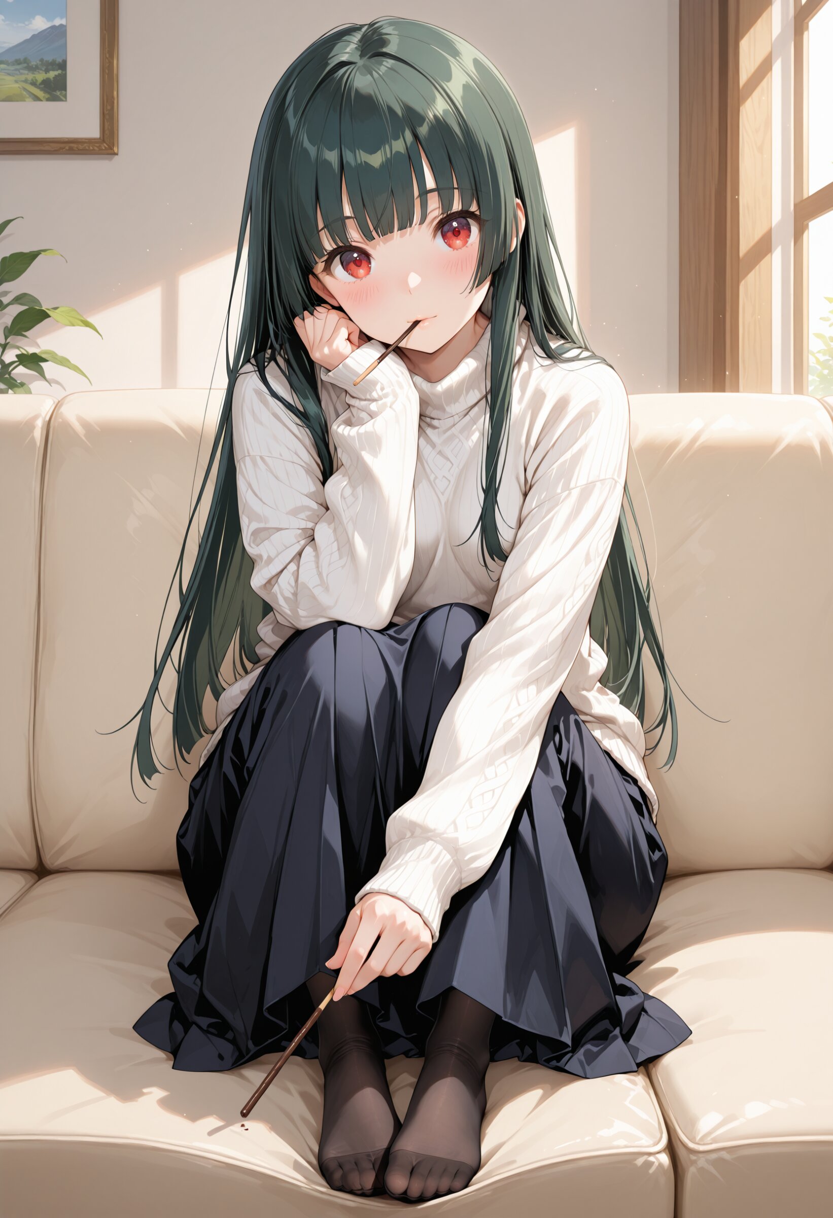 masterpiece,best quality,ultra-detailed,high resolution,super detailed skin,perfect anatomy,beautiful detailed eyes, Detailed Beautiful Face, 1girl, solo, dark green hair, long hair, hime cut, red eyes, small breasts, Blush, looking at viewer, long sleeves, sitting, full body, long skirt, indoors, sweater, lips, head tilt, holding a pocky stick in her mouth, soft gaze, offering a pocky stick forward, inviting gesture, warm mood, no shoes, couch, knees up, on couch