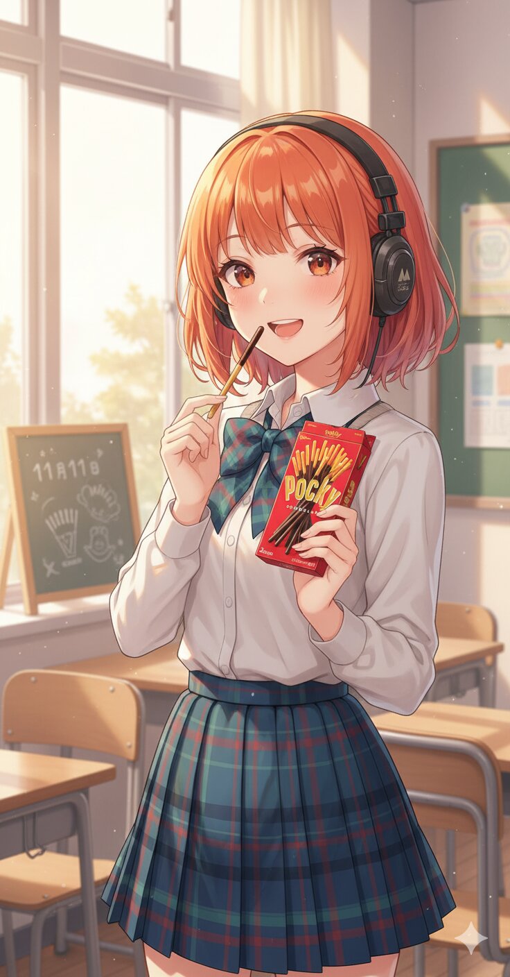 In a cozy classroom filled with golden afternoon light, Zena with her signature orange bob hair and headphones playfully holds a Pocky stick to her cheek. She wears a school uniform with a plaid skirt and scarf, smiling brightly as the camera rolls. The scene radiates youth, sweetness, and transparent light, perfect for a commercial. Ultra-detailed, cinematic composition, pastel glow, cheerful realism.