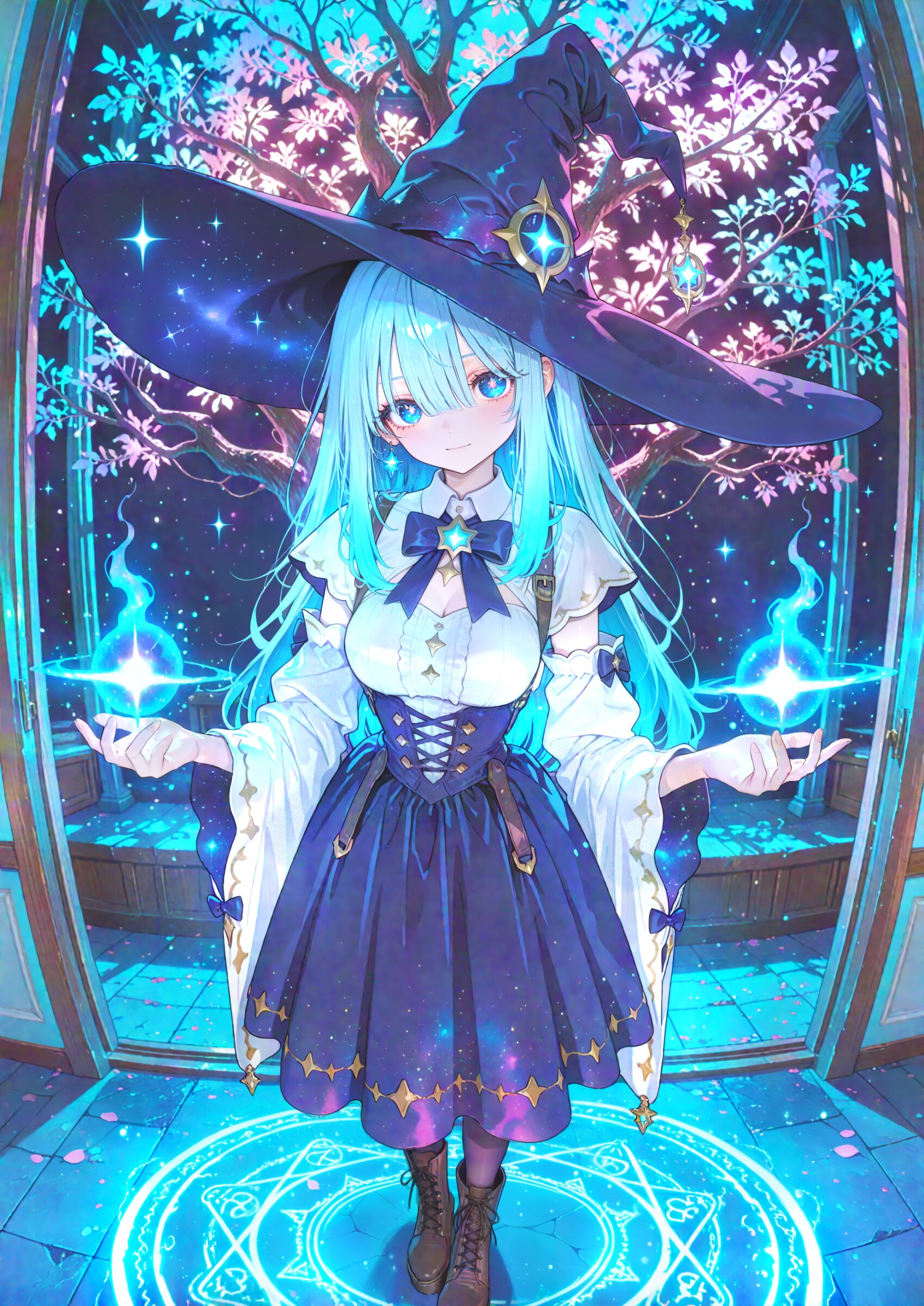 (fisheye,fisheye lens angle:1.0), (high angle shot:1.1) , 1girl, witch girl, blue eyes, beautiful iridescence eyes, beautiful detailed eyes, beautiful light blue hair, long bangs, long disheveled beautiful hair, first-rate female bodies, perfect body, beautiful breasts, framed breasts, cool face, (Beautiful Lips:0.7),, long hair, (stylish beautiful witch dress:1.2), detached sleeves, (cute dark blue and white witch girl costume:0.9), (white blouse:1.3), bow tie, witch long skirt (overskirt:1.1) white cape, (blue galaxy witch hat:1.1), lace-up boots on feet, stockings and suspenders,, mysterious face, light smile steaming , dramatic lighting, drawstring, drawing magic circle, masterpiece, best quality, amazing quality, very aesthetic, absurdres, newest, you can add scenery, (volumetric lighting), To make the background more distinctive. professional art lots of details, , overexposure, shiny-glistening, (watercolor style:0.0), (pastel color style:0.0) 4ur4_illu,shiny, glowing, glowing particles, magenta tree, <lora:noline (1):-0.5> <lora:sdxl2-flat2-512b:0.2> <lora:facelightup_xl_v10:0.5> <lora:V2_yakumo_alchemy:0.5> <lora:Aura_illu:0.1>