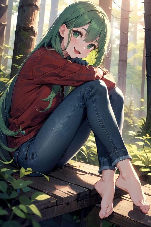 森にて素足にジーンズの緑髪少女