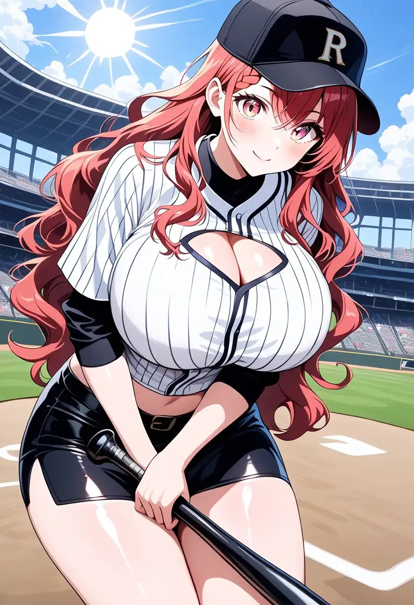 [baseball uniform]++, [baseball cap]++, [holding baseball bat]++, [baseball stadium]++, [midriff]++, [huge breasts]++, perky breasts, hanging breasts, curvy, BREAK [cleavage cutout]++, [cleavage]++, [miniskirt]++, bare legs, legs together, standing, BREAK tall, [long hair]++, [shiny]++, [shiny skin]++, [shiny clothes]++, [big eyes]++, [shining eyes]++, smile, blush, closed mouth, BREAK outdoors, sun, day, [audience]++, [wavy hair]++, [One Bat]++,