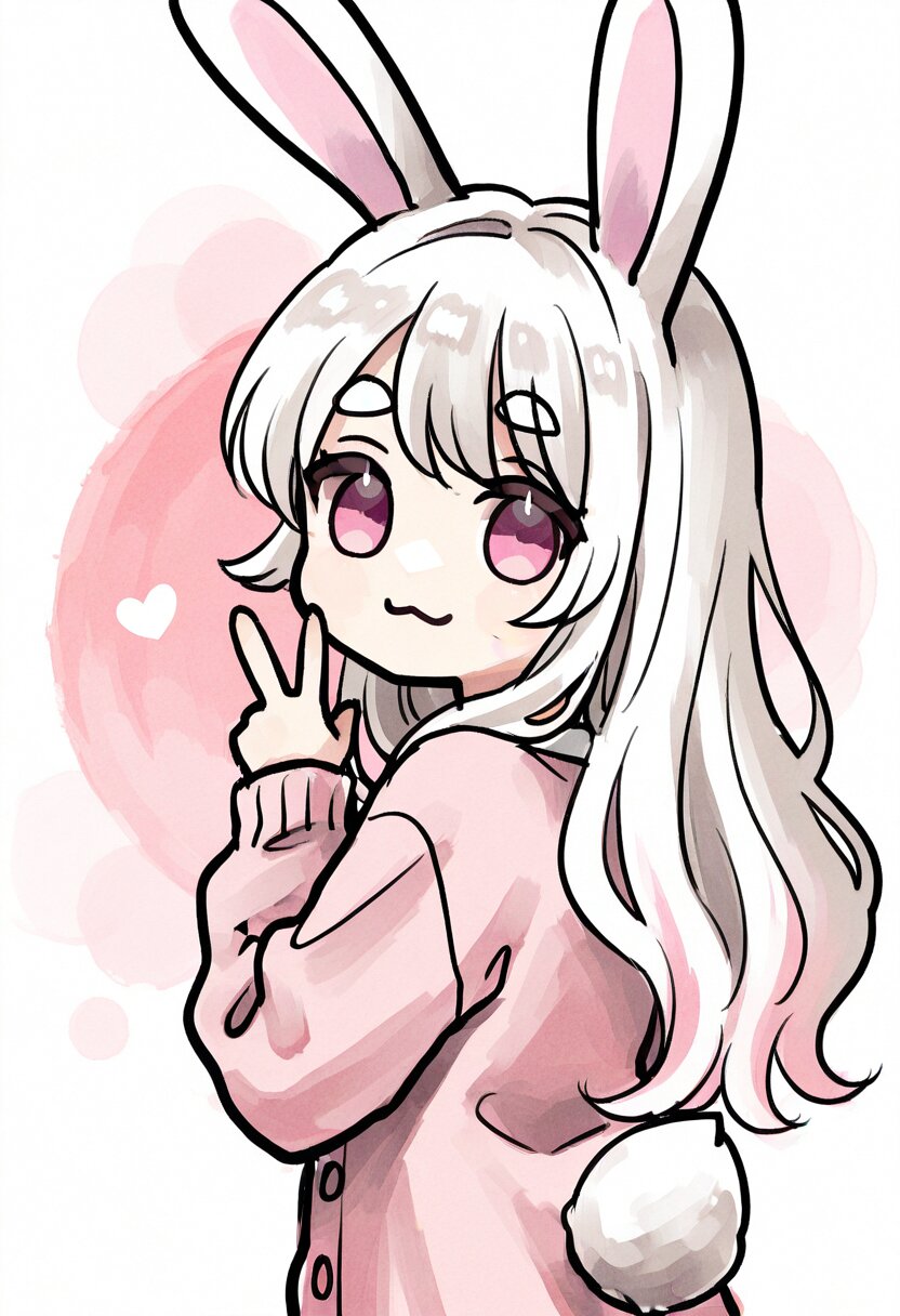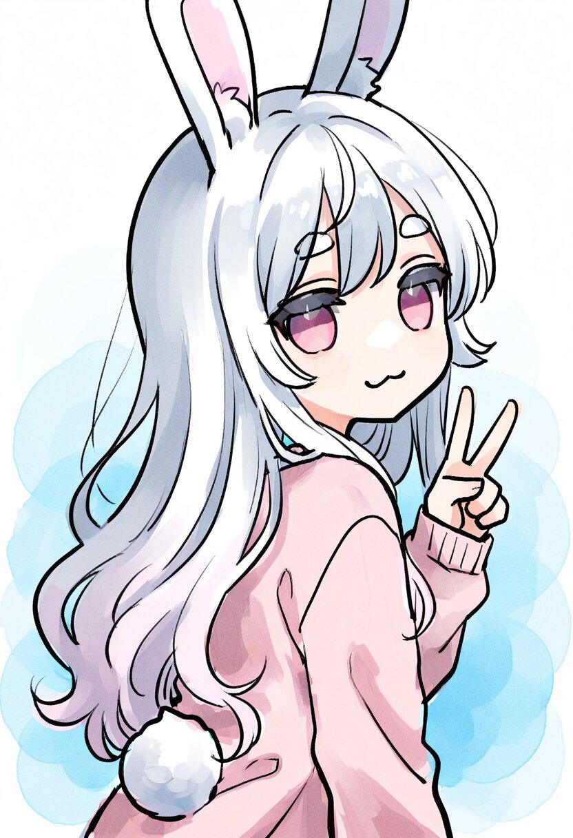 <lora:inmnstyleilxl:0.9>, best quality, masterpiece, very aesthetic, watercolor painting, general, pastelcolors, 1girl, chibi, solo, white hair, long hair, wavy hair, light_pink_colored_tips, pink eyes, smile, :3, light pink cardigan, rabbit ears, rabbit tail, look back, v, looking at viewer, upper body <lora:erase_human_ear_v10_ill:1>