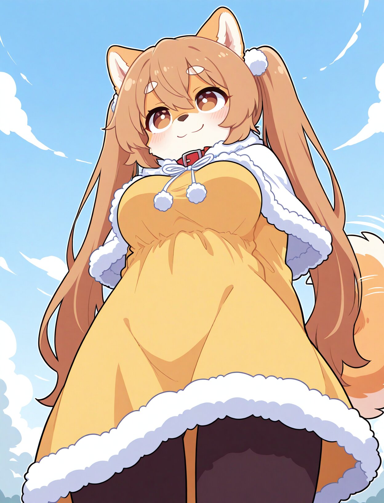 1girl,solo,short female,oppai loli,(dog girl),(shiba-inu girl),(furry:1.3),shiba-inu ears,ears up,fluffy ears,dog nose,snout,shiba-inu tail,(body fur:1.2),stand fur,fluffy fur,curled tail,(large breasts),light-brown hair,long hair,long twintail,high twintail,white thick eyebrows,hair between eyes,brown eyes,round eyes,smile,casual outfit,layering,animal collar,fur-trimmed capelet,white capelet,pom-pom drawstring,fluffy dress,yellow dress,toweling dress,fur-trimmed dress,medium dress,fur-trimmed sleeve cuffs,black pantyhose,tail wagging,snowy,falling snowflake,facing up,motion lines,motion trails,motion blur,afterimage,cloud,sky background,from front,from below,low angle,hair shade,((high contrast)),(anime coloring),(kawaii),softy,(2D),(cute),furry,(two tone fur),(furry body),perfect body,detailed face,high quality,cute clothes,animal tail,animal ears,solo,masterpiece,((correct_anatomy)),Bright colors, Contour line, pale painting,,(detailed_hands:1.5),flat color, no lineart,lolitaaa, girl, small body, short girl, petite, very short, tiny, cute