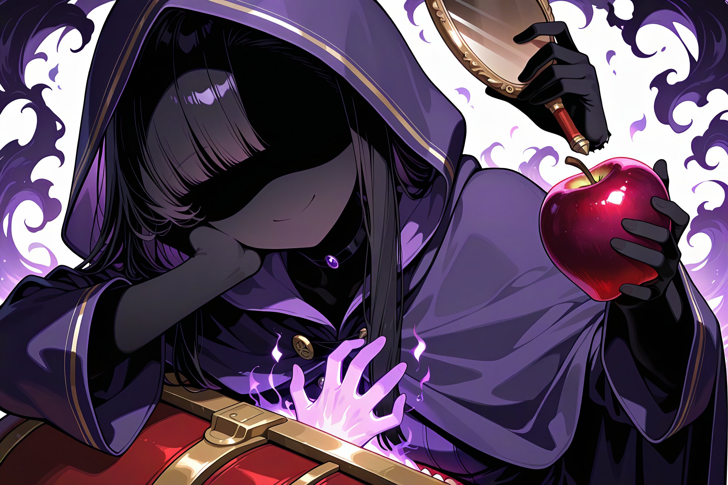 1 shadow little girl, solo, upper body, masterpiece, best quality, amazing quality, very aesthetic, shadow girl, (shadow face:1.5), shadow skin, shadow hair, long hair, straight hair, asymmetrical bangs, no ears, no eyes, no nose, (floating black ghosty hands:1.2), closed mouth, smile, cheerful, choker, purple dress, purple hooded cloak, hood on, holding purple apple, holding mirror, head rest, in mimic chest, dark aura,