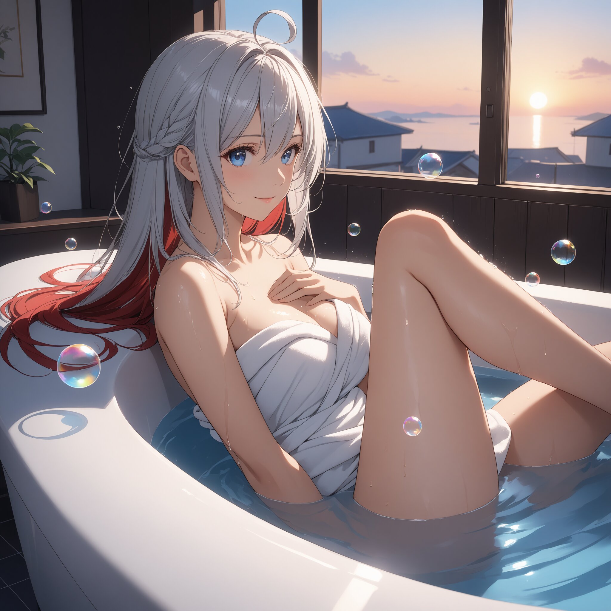 masterpiece, best quality, photorealistic, sharp focus, cinematic lighting, depth of field, beautiful composition, vibrant colors, ultra high res, 8K, highly detailed, masterpiece, best quality, very detailed, lora:alisa_mikhailovna_kujou-roshidere_s1-ixl-anime-soralz:1, alisa mikhailovna kujou (roshidere), 1girl, light smile, blue eyes, long hair, silver hair, ahoge, crossed bangs, red hair ribbon, sidelocks, looking at viewer, profile, wrapped in bath towel, wet hair, wet body, sweat, bathing, in bathtub, from side, backlighting, gradient blue sky, cute sunset, hand on own chest, floating soap bubbles, lying back, leaning back, visible leg, one leg up, outstretched leg forward, long leg, visible foot, wide shot, inviting pose