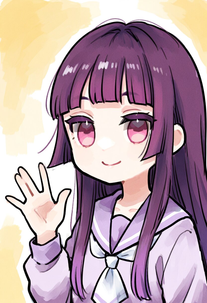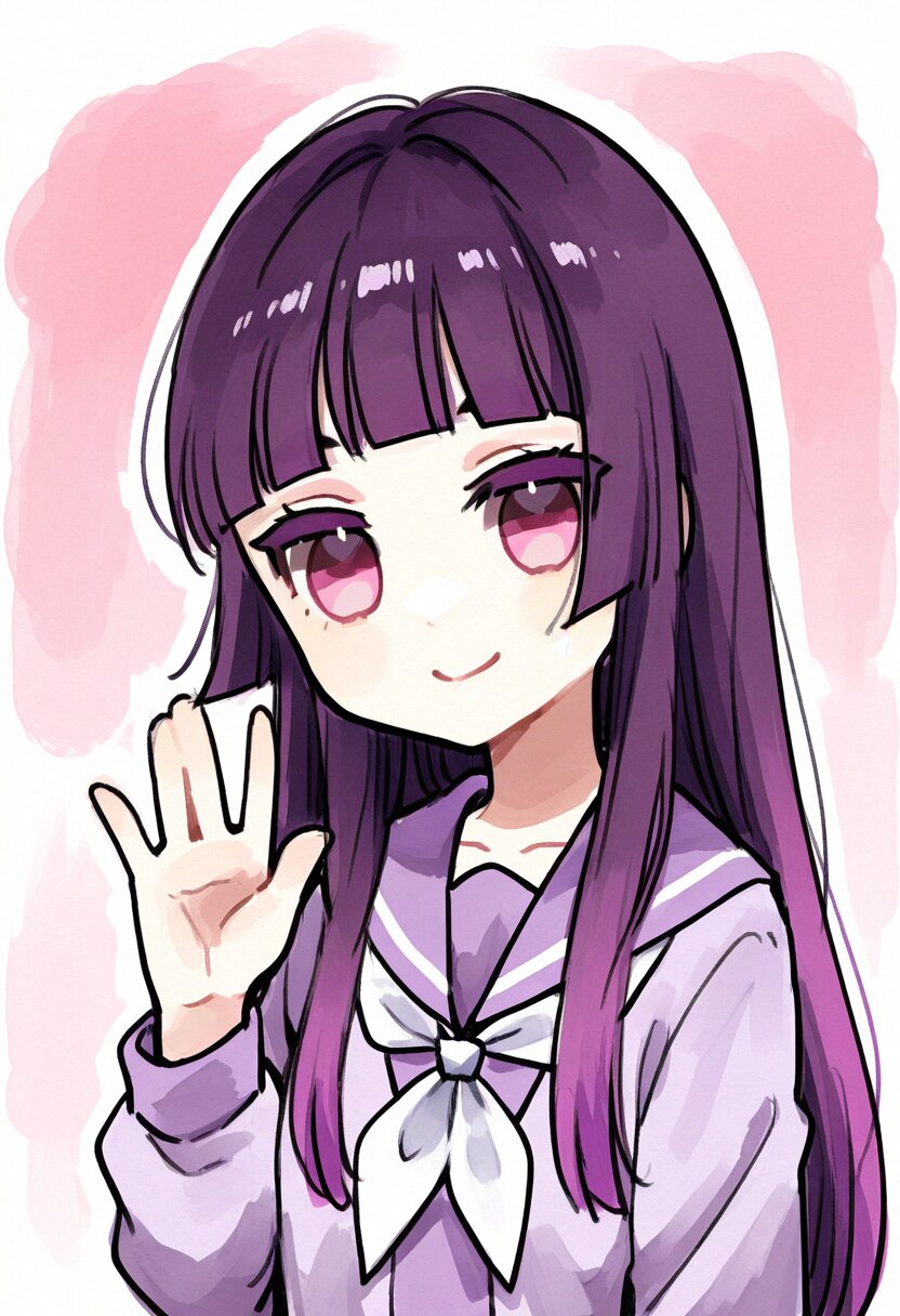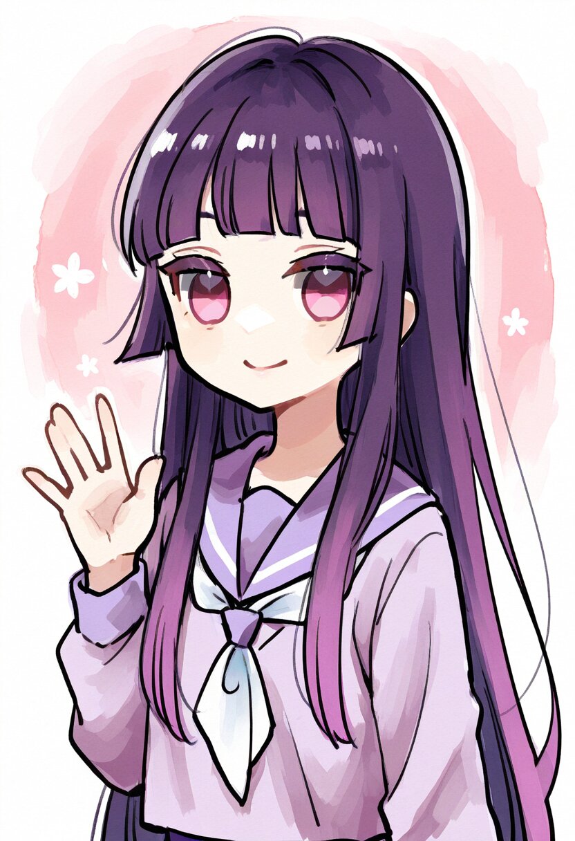 <lora:inmnstyleilxl:0.9>, best quality, masterpiece, very aesthetic, watercolor painting, general, pastelcolors, 1girl, chibi, solo, purple hair, hime cut, pink_colored_tips, pink eyes, purple sailor suit, white ribbon tie, upper body, smile, waving, looking at viewer