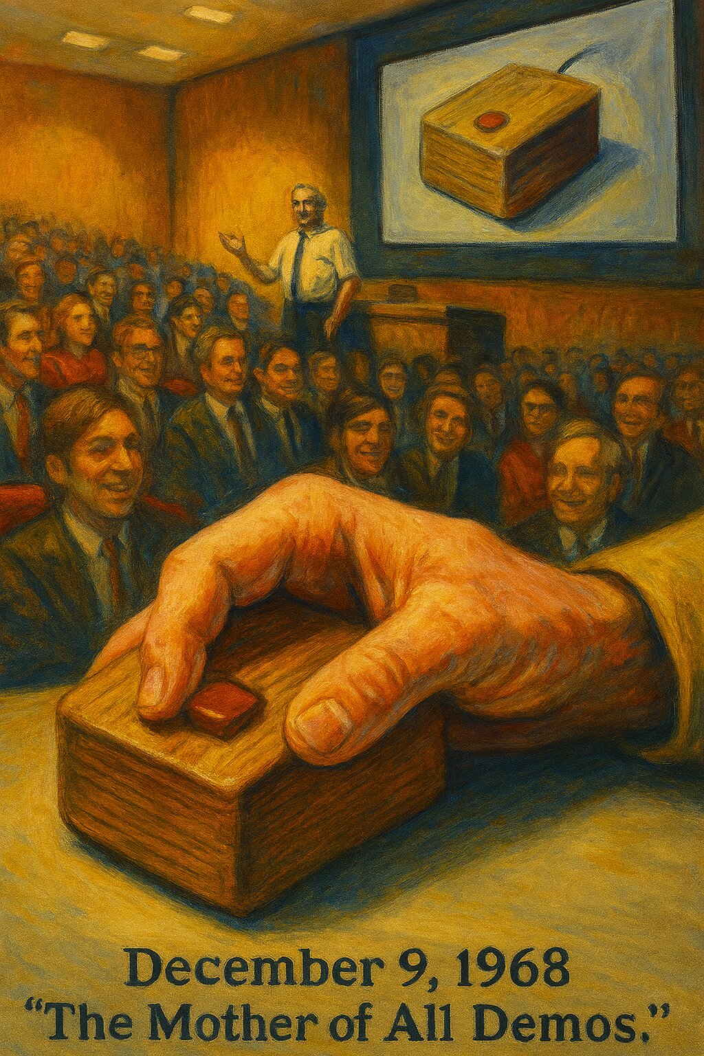 Please draw it in color. The date is December 9, 1968. Douglas Engelbart is performing “The Mother of All Demos.” He is demonstrating the operation of a mouse developed for new computing. Only his wrist is in close-up, his hand gripping a prototype mouse. The audience's fervor for the future permeates the venue's atmosphere.