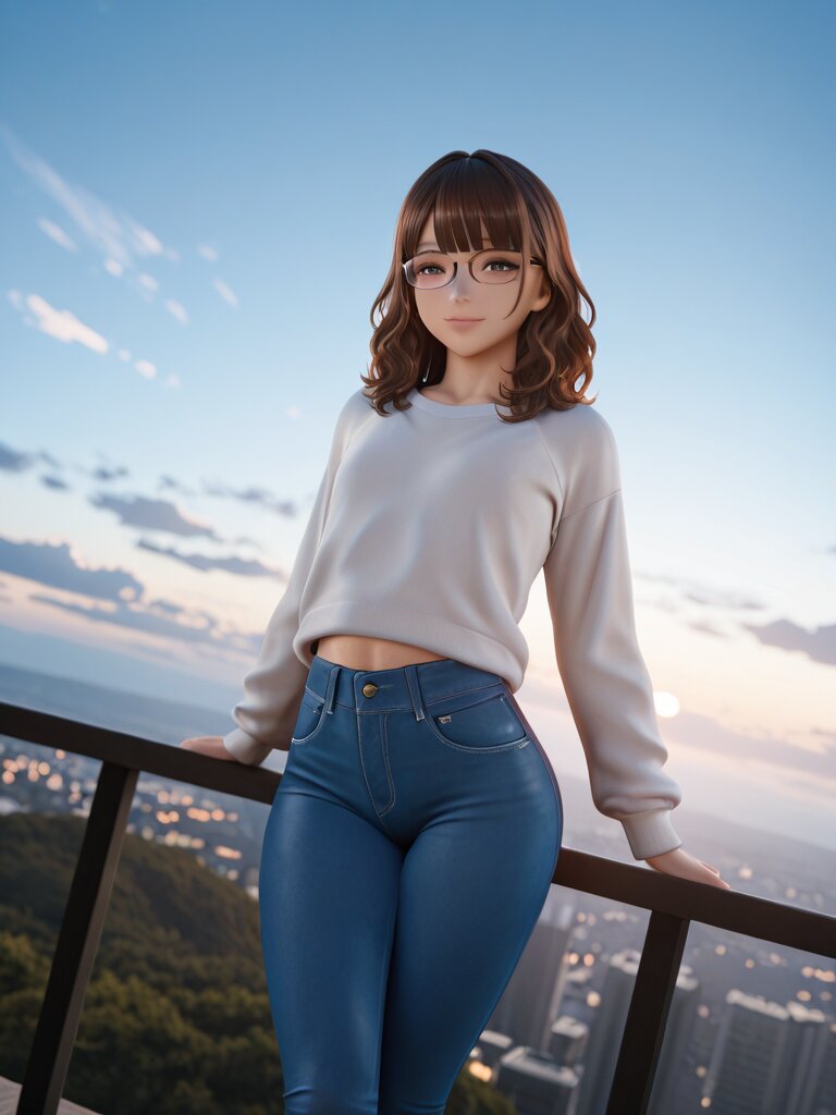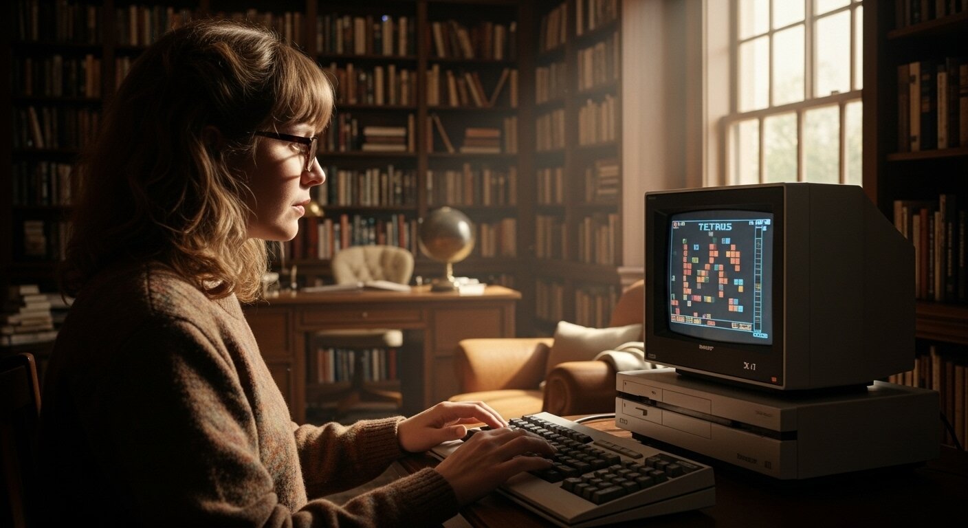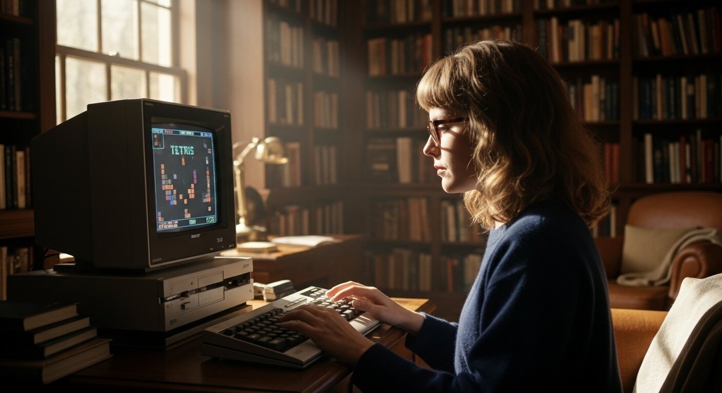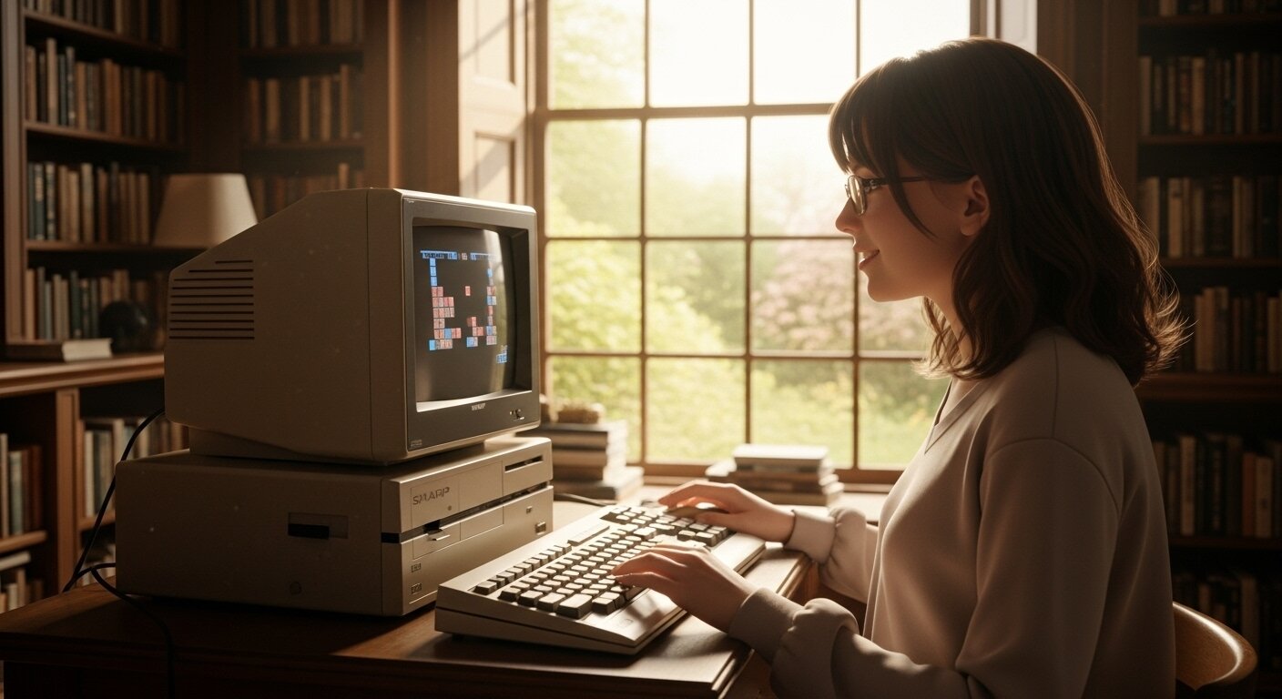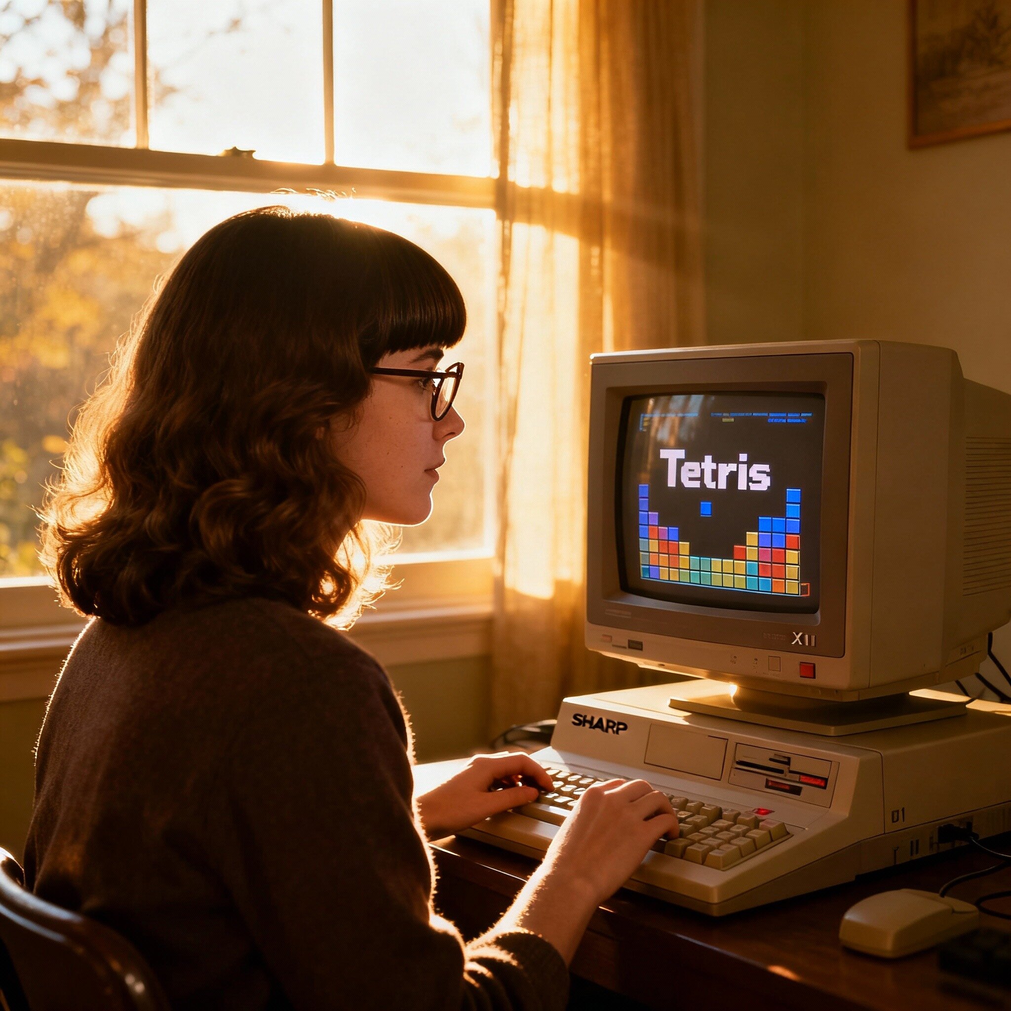 Late November 1988. The game “Tetris” for Japanese PC manufacturers was released. She is playing “Tetris” on Sharp's X1. Her profile shows her enjoying the game. The monitor is visible in front of her face. She is wearing glasses. Her hairstyle is blunt bangs with brown hair, medium length, and wavy. Sunlight streaming through the window gently envelops the room's atmosphere. A peaceful time flows between her and the Sharp X1.