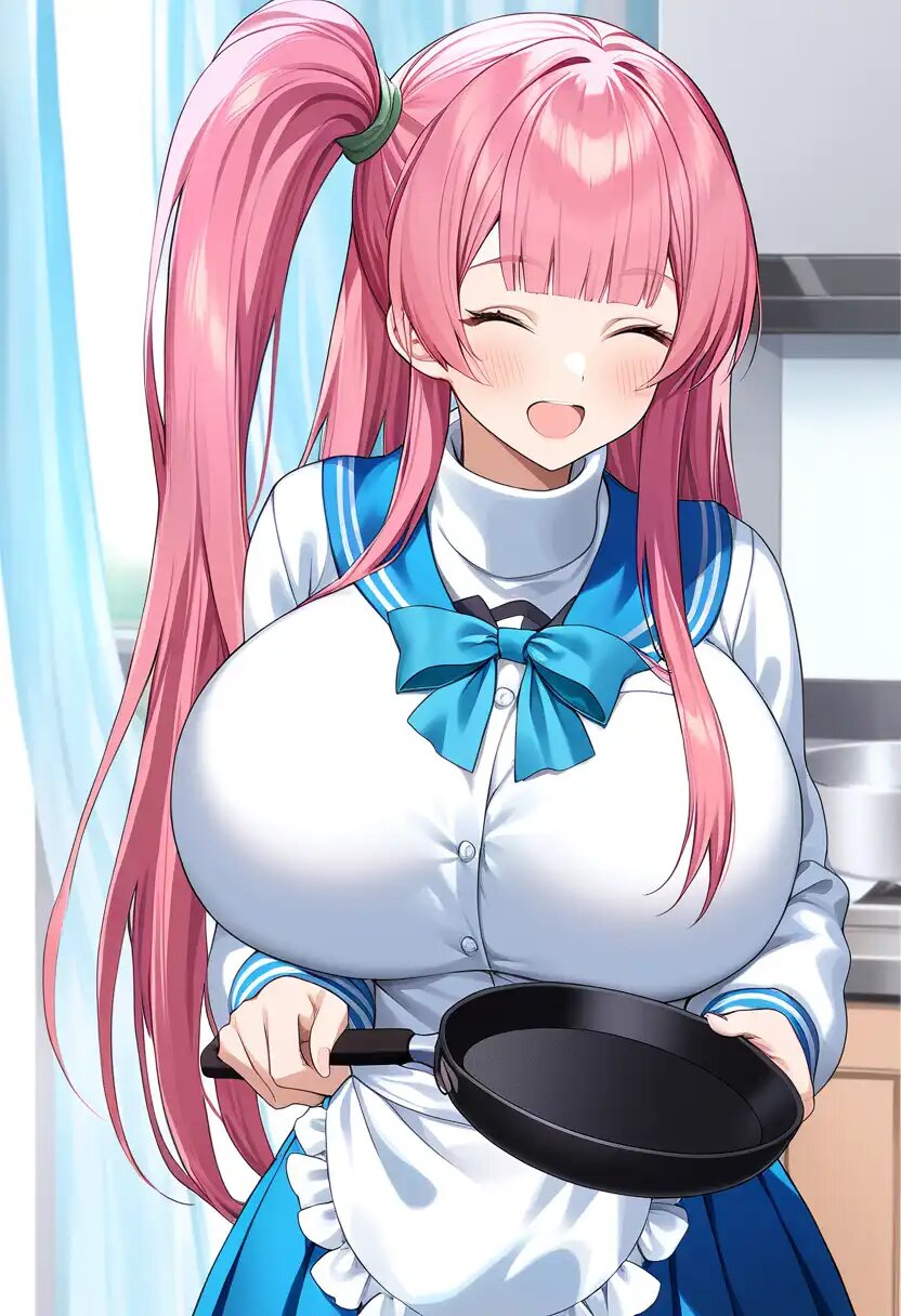 [holding frying pan]++, [apron]++, [Cooking practice room]++, [huge breasts]++, perky breasts, hanging breasts, curvy, BREAK [school uniform]++, [winter clothes]++, long sleeves, [upper body]++, BREAK tall, [long hair]++, [straight hair]++, [shiny]++, [shiny skin]++, [shiny clothes]++, smile, blush, [closed eyes]++, open mouth, BREAK indoors, day, window, curtains, [high side ponytail]++,