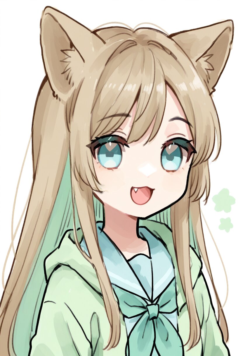 <lora:inmnstyleilxl:0.9>, best quality, masterpiece, very aesthetic, watercolor painting, general, pastelcolors, 1girl, chibi, solo, light brown hair, long hair, long sidelocks, light_green_colored_inner_hair, light blue eyes, light_brown_cat_ears, light blue sailor suit, light green hoodie, upper body, smile, open mouth, looking at viewer, fang, white background <lora:erase_human_ear_v10_ill:1>