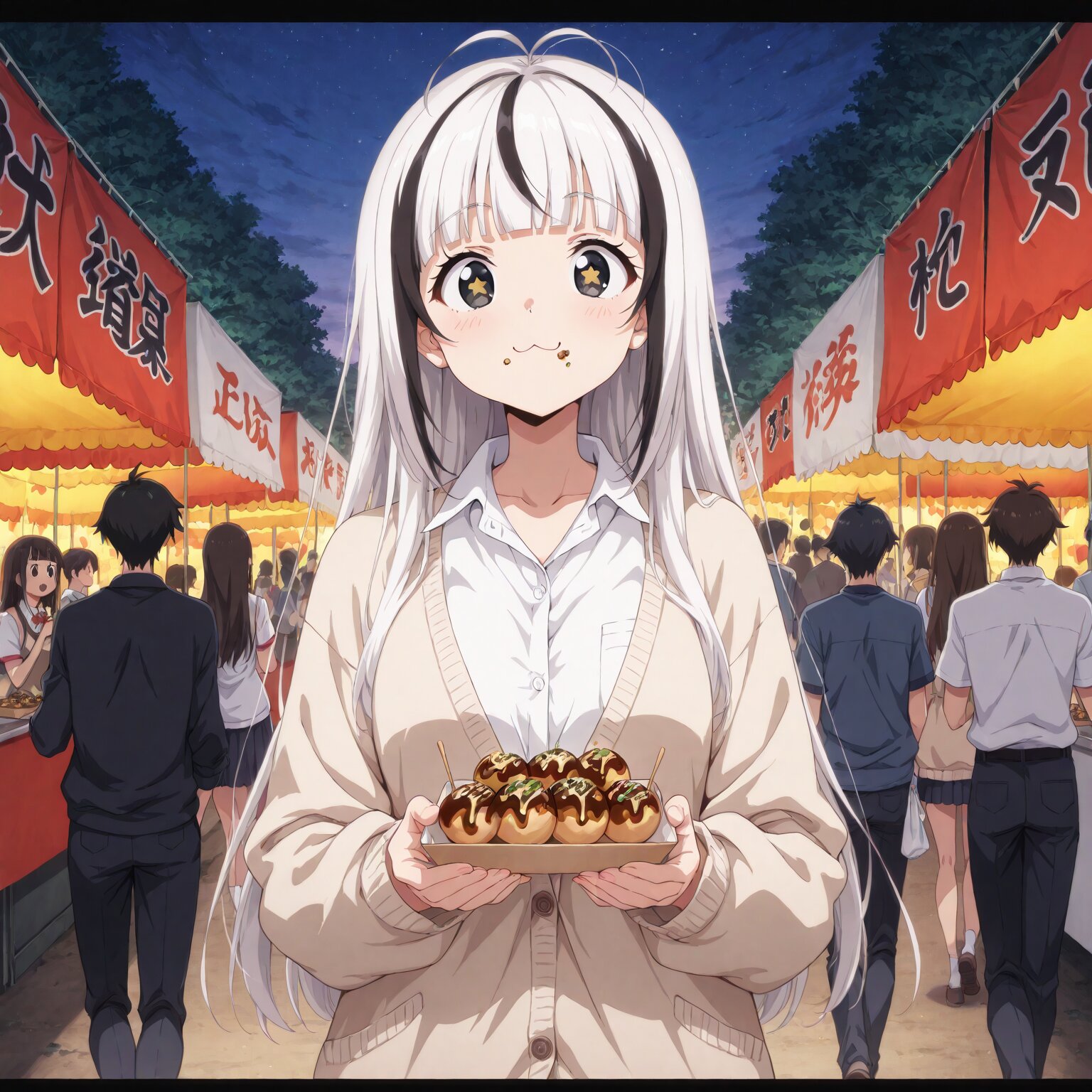 (1girl), Medium long hair, straight hair, white hair, (black streaked hair:1.3), blunt bangs, antenna hair, (tareme), round eyes, star-shaped pupils, Black eyes cat mouth, :3 dress shirt, cardigan, open front Holding takoyaki, eating takoyaki, walking, eating while walking from side School, school festival, food stall, bustle, crowd, large crowd BREAK, ((newest, anime, animation, anime screen capture, anime style:1.3)) BREAK, ((masterpiece, , vibrant, very aesthetic, highly detailed, best quality, 16k:1.3)) perfect fingers,