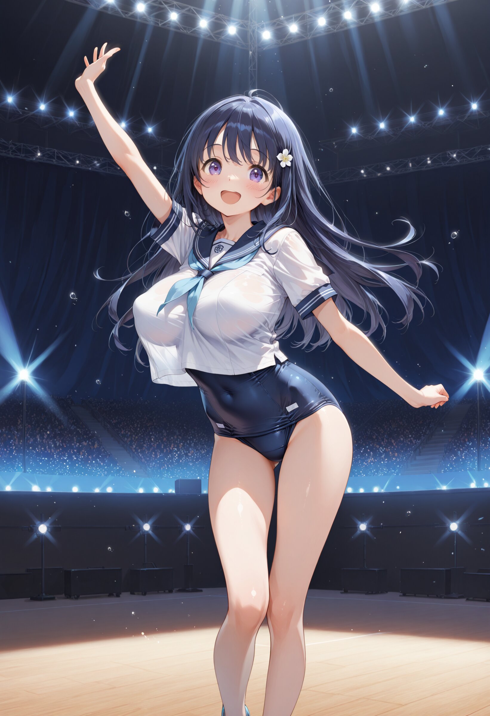 masterpiece, best quality, amazing quality, general, fine detail, official art, 1girl, loli, long hair, school swimsuit, white sailor shirt, navy blue sailor collar, short sleeves, beautiful legs, (fully clothed huge breasts:1.2), (perky breasts:1.4), slim legs, happy, schoolground, on stage, dancing, dynamic action,